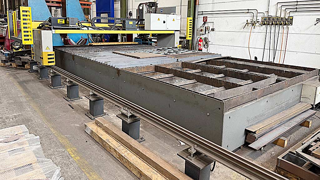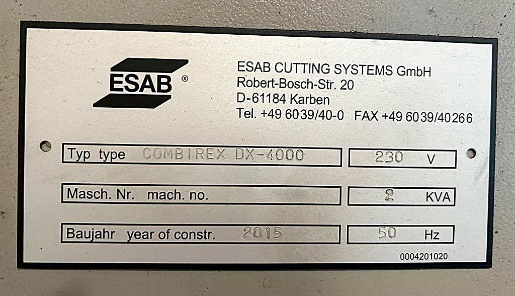 | Beschreibung Eine CNC-Portal-Brennschneidanlage ESAB steht zur Verfügung. Spurbreite: 4000mm, Schneidedimensionen X/Y: 3000mm/6000mm, Laufbahnlänge: 8000mm, Laufbahnhöhe: 465mm, Tischhöhe: 700mm, Schneidgeschwindigkeit: 24m/min, Brennschneidtischdimensionen X/Y: 3100mm/6180mm. Schneidverfahren: Autogen/Plasma, Brenner: Cooljet-Pro, Plasmaquelle: m3 202 EPP 202 GEN 2, Plasmabrenner: PT-36. Filterleistung: 9000m³/h, Filterfläche: 180m², Partikelgröße: 0,1µm. Die Plasmaquellenkühlung muss repariert werden. Dokumentation vorhanden. Eine Besichtigung vor Ort ist möglich. |