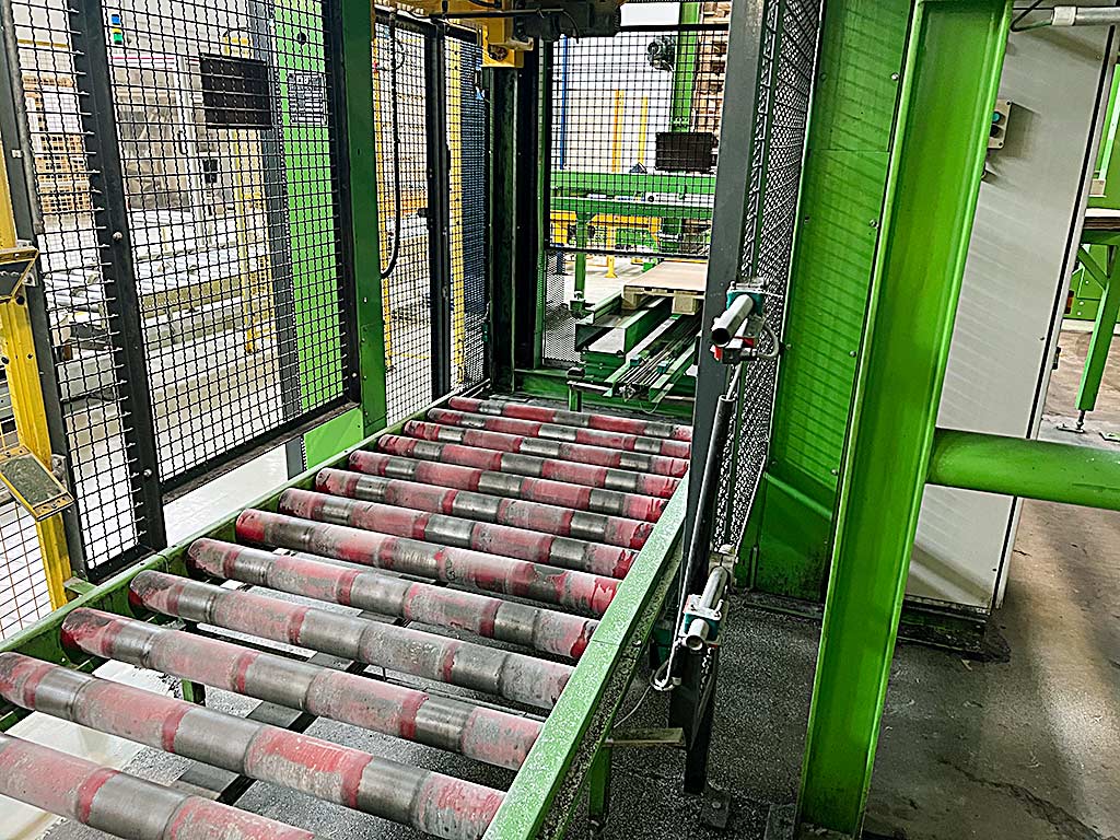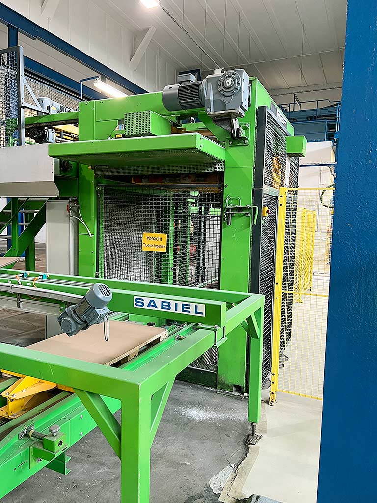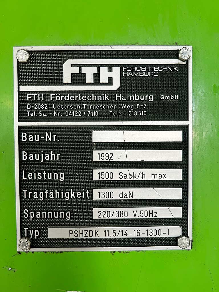 Beschreibung Eine Sackpalettieranlage FTH Fördertechnik steht zur Verfügung. Verband: 5er, Palettierleistung: ca. 1500 Säcke/h, Palettendimensionen X/Y 1: 1200mm/800mm, Palettendimensionen X/Y 2: 1200mm/1000mm, Stapelmuster: veränderbar, Gesamtanlagendimensionen X/Y: ca. 12600mm/5700mm. Eine Besichtigung vor Ort ist möglich. |