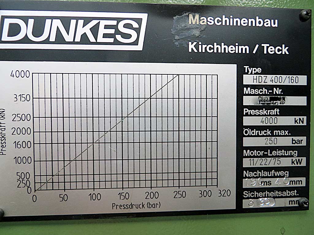 Beschreibung Presskraft: 4000kN, Pressdruck: 320bar, Öldruck: 250bar, Ziehkissenkraft: 1600kN, Ziehkissenhub: 200mm, Ziehkissendimensionen X/Y: 1000mm/800mm, Ziehkissen-Ausstoßerkraft: 160kN, Auswerferkraft: 63kN, Auswerferhub: 100mm, Nachlaufweg: 40mm, Nachlaufzeit: 190ms. Dokumentation vorhanden. Eine Besichtigung vor Ort ist möglich. |