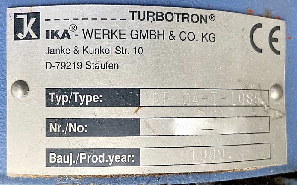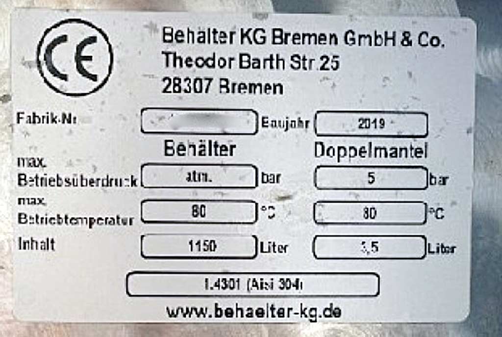 Beschreibung Ein Rührwerksbehälter KG Bremen und zwei Rührwerke PRG und IKA stehen zur Verfügung. 1) Rührwerksbehälter KG Bremen, Baujahr: 2019, max. Betriebsdruck: Atmosphäre, max. Betriebstemperatur: 80°C, Volumen: 1150l, max. Doppelmantel-Betriebsüberdruck: 5bar, max. Doppelmantel-Betriebstemperatur: 80°C, Material: 1.4301. 2) Präzisionsrührer PRG R112M-6, Baujahr: 2004, Rührwerkslänge: 930mm, Rührorgandurchmesser: 160mm. 3) Präzisionsrührer IKA RF 04-T-1085, Baujahr: 1999, Gesamtlänge: 1100mm, Rührorgandurchmesser 1/2: 160mm/200mm. Eine Besichtigung vor Ort ist möglich. |