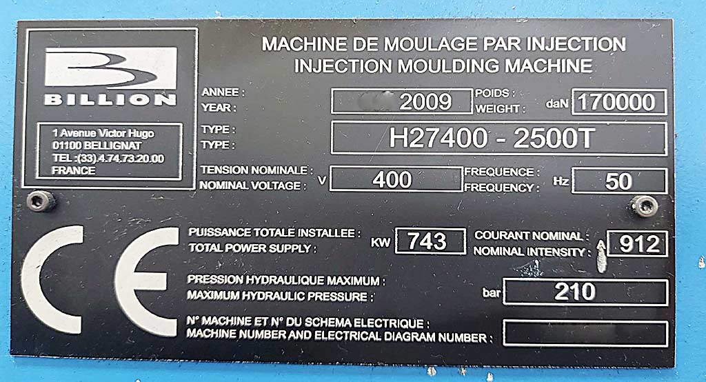 Beschreibung Eine hydraulische Zwei-Platten-Spritzgießmaschine Billion (komplette Spritzgießerei) für Großteile inklusive Roboterautomatisierung, Dosieranlage und Trichter steht zur Verfügung. Schließkraft: 2500t (25000kN), Gesamtleistung: 743kW, max. Hydraulikdruck: 210bar, max. Werkzeuggewicht: 72700kg, Ejektorhub min./max.: 830mm/1900mm, max. Werkzeugstärke: 652mm, Düsenspitzenmaterial: 42CrMo, max. Düsenspitzenbetriebsdruck: 900MPa, Hydraulikölsorte: ISO VG 46, Hydrauliköl-Tankvolumen: 2500l, max. Pumpendruck: 210bar, Schneckendurchmesser: 145mm, Einspritzdruck: 1850bar, Einspritzvolumen: 8400cm³, Einspritzgeschwindigkeit: 160mm/s, Plastifizierleistung: 1150g/s, Werkzeuggeschwindigkeit Öffnen/Schließen: 450mm/500mm/s. Maschinendimensionen X/Y/Z: ca. 14550mm/3800mm/4100mm, Transportgewicht: ca. 170t, Steuerung: Billion Dixit 2, Betriebsstunden: 34054h. Der Motor des Schneckenzylinders und 2 kleine Ventile an der Roboterachse Z müssen ersetzt werden. Dokumentation vorhanden. Eine Besichtigung vor Ort ist möglich. |