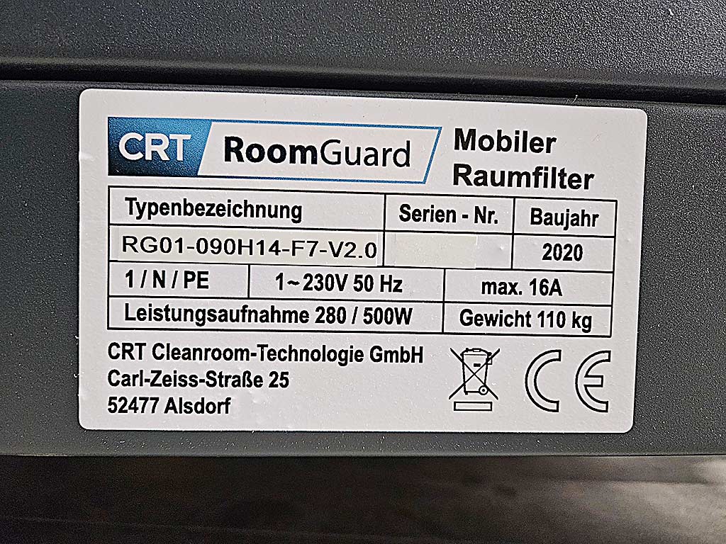 Beschreibung Drei Raumfilteranlagen CRT RoomGuard stehen zur Verfügung. Luftvolumenstrom: 2000m³/h, Vorfilter: F7, Hauptfilter: HEPA H14, max. Wirksamkeit (Aerosolen/Viren): 99,9%, Maschinendimensionen X/Y/Z: ca. 1300mm/800mm/700mm, Gewicht: ca. 110kg. Dokumentation vorhanden. Eine Besichtigung vor Ort ist möglich. |
