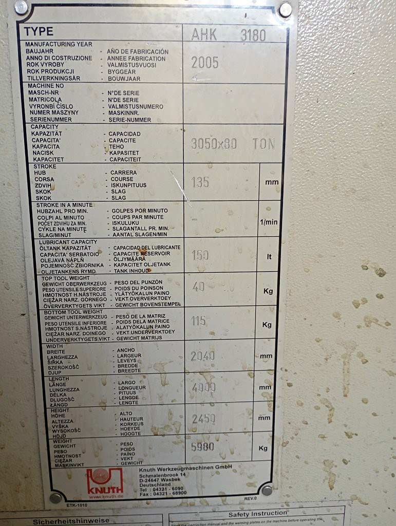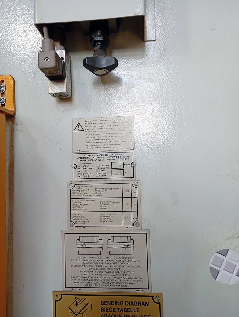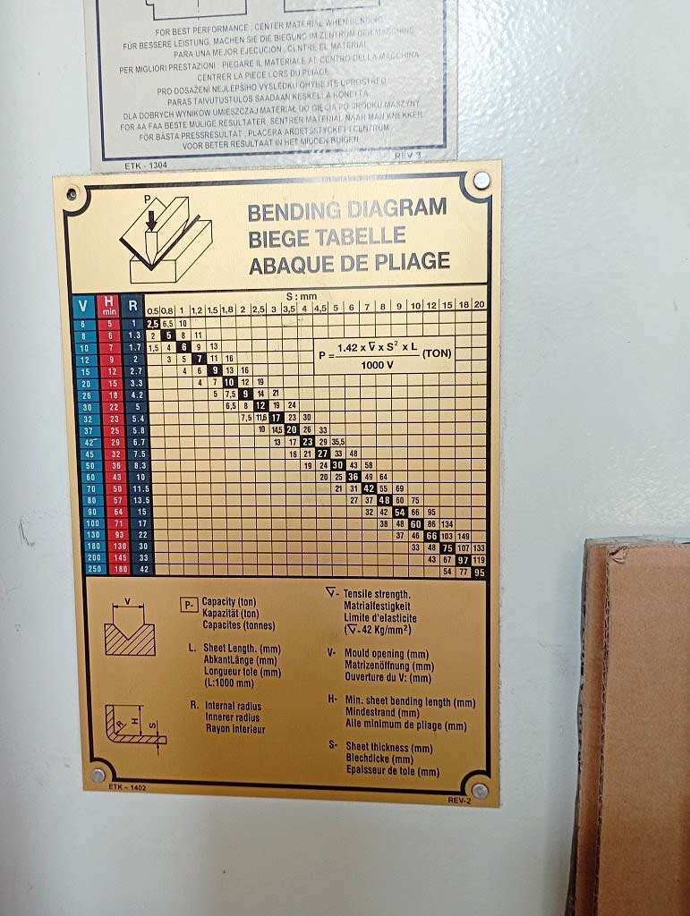 Beschreibung Hub: 135mm, max. Blechstärke: 20mm, max. Abkantlänge: 3050mm, Presskraft: 80t, max. Betriebsdruck: 2975psi, max. Matrizenöffnung: 250mm, Biegewinkelbereich: 1°-42°, Ölkapazität: 150l, max. Werkzeuggewicht oben/unten: 40kg/115kg. Maschinendimensionen X/Y/Z: ca. 4000mm/2050mm/2450mm, Gewicht: ca. 6000kg. Dokumentation vorhanden. Eine Besichtigung vor Ort ist möglich. |