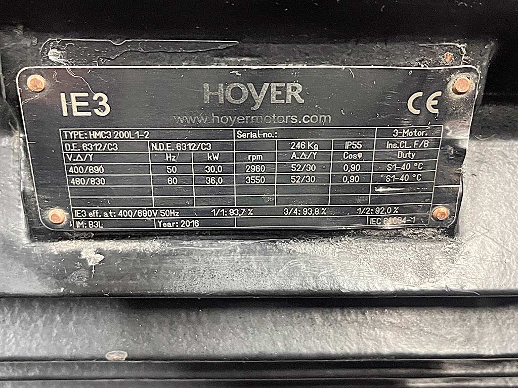 Beschreibung Ein Drehstrom-Asynchronmotor Hoyer steht zur Verfügung. Schutzart: IP55, Isolationsklasse: F/B, Bauform: IM B3L, Wirkungsgradklasse: IE3, Leistung: 30kW/36kW, Leistungsfaktor: 0,90, Betriebsart: S1, Gewicht: ca. 250kg. Eine Besichtigung vor Ort ist möglich. |