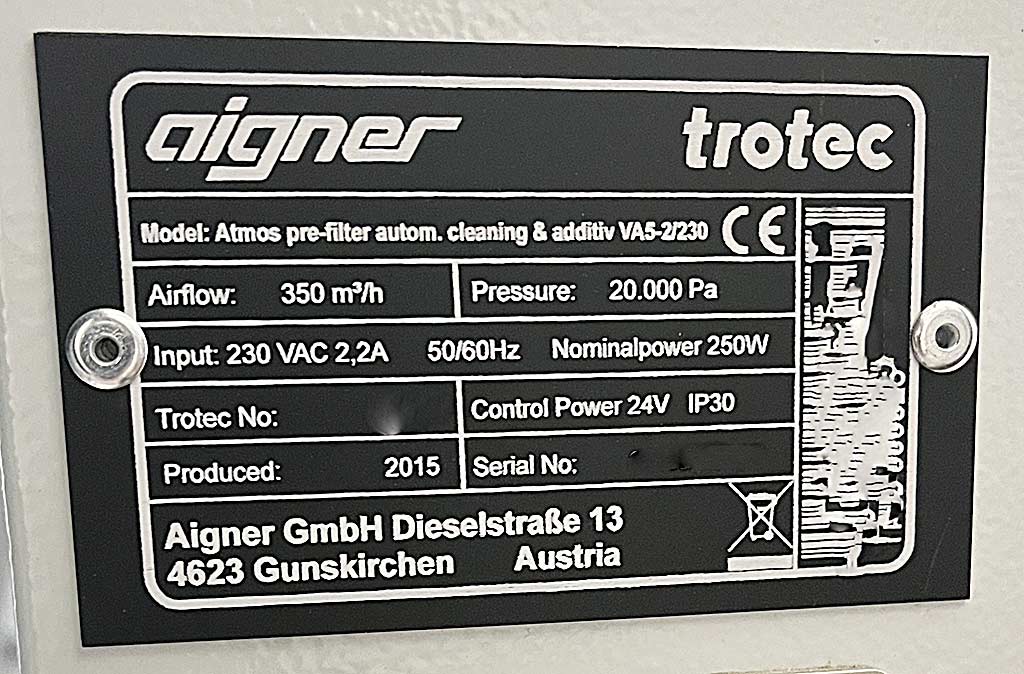 Beschreibung Eine mobile Absaug- und Filteranlage Aigner steht zur Verfügung. Volumenstrom: 350m³/h, Leistung: 250W, max. Unterdruck: 20000Pa, Filtermaterial: Polyester/Aluminium, Filterfläche: 4m², Staubbehältervolumen: 20l, Additiv-Füllmenge: 16l. Maschinendimensionen X/Y/Z: ca. 450mm/420mm/1300mm, Gewicht: ca. 70kg. Eine Besichtigung vor Ort ist möglich. |