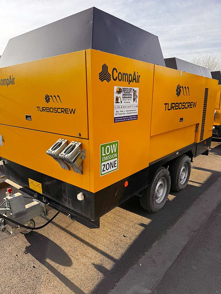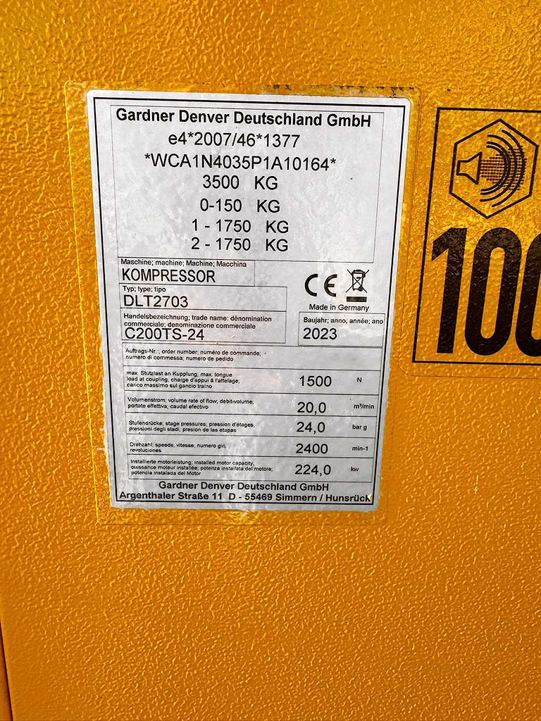 | Beschreibung Eine mobile Diesel-Schraubenkompressoranlage CompAir, für den Baustelleneinsatz geeignet, steht zur Verfügung. Volumenstrom: 20m³/min, max. Betriebsdruck: 24bar, Motorleistung: 224kW, Motor: Cummins QSB6.7, Fahrwerk: höhenverstellbar, Kraftstofftankvolumen: 350l. Maschinendimensionen: ca. 5500mm/2000mm/2700mm, Gewicht: ca. 3500kg. Dokumentation vorhanden. Eine Besichtigung vor Ort ist möglich. |