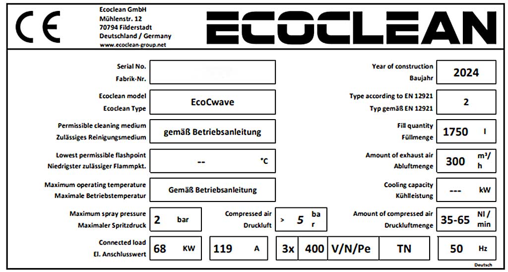 | Beschreibung Eine originalverpackte Spritz-Flut-Reinigungsanlage Ecoclean mit vakuumfester Arbeitskammer steht zur Verfügung. Arbeitskammerdurchmesser 1: 650mm, Arbeitskammerdurchmesser 2: 750mm, max. Korbdimensionen 1 X/Y/Z: 670mm/480mm/300mm, max. Korbdimensionen 2 X/Y/Z: 670mm/480mm/400mm, max. Chargengewicht: 150kg, max. Türöffnungswinkel: 135°, max. Spritzdruck: 2bar, Füllmenge: ca. 1750l. Maschinendimensionen X/Y/Z: ca. 3450mm/2000mm/2700mm, Gewicht: ca. 4200kg. Dokumentation vorhanden. Eine Besichtigung vor Ort ist möglich. Die Maschine wurde nie ausgepackt. |