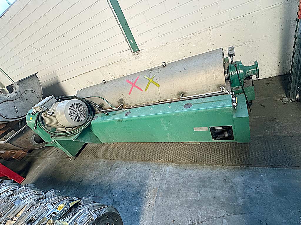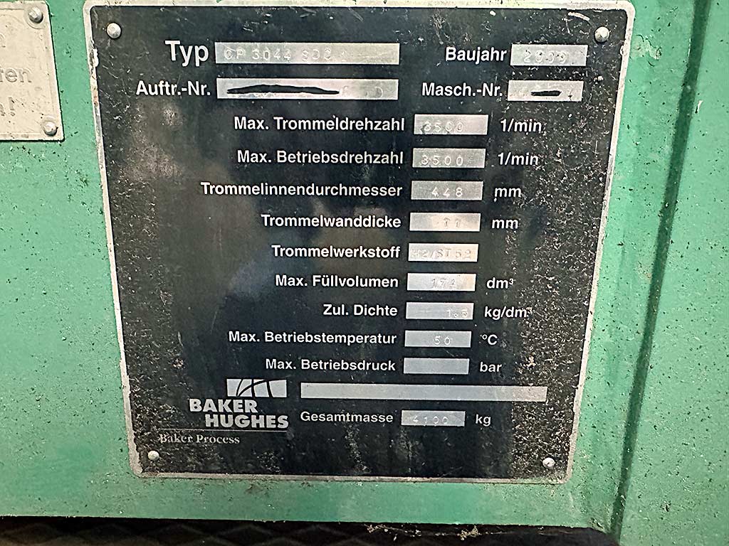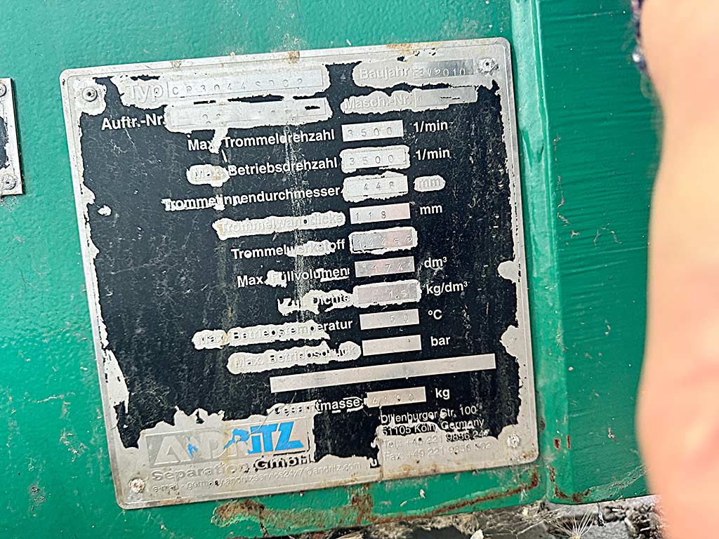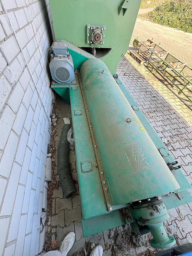 | Beschreibung Zwei nahezu baugleiche Dekanter Andritz stehen zur Verfügung. Trommeldrehzahl: 3500U/min, Trommelinnendurchmesser: 448mm, Trommelwandstärke: 11mm, Trommelwerkstoff: H2/ST52, max. Füllvolumen: 174dm³, max. Dichte: 1,5kg/d³, max. Betriebstemperatur: 50°C, Aufgabematerial: Klärschaum, max. Aufgabematerialdichte: 1050kg/m³, max. Feststoffdichte: 1100kg/m³, max. Flüssigkeitsdichte: 1000kg/m³, Feststoffkonzentration: 8M%, Gewicht: ca. 4100kg. Eine der Maschinen (SDC2) wurde im Jahr 2010 revidiert. Dokumentation vorhanden. Eine Besichtigung vor Ort ist möglich. |