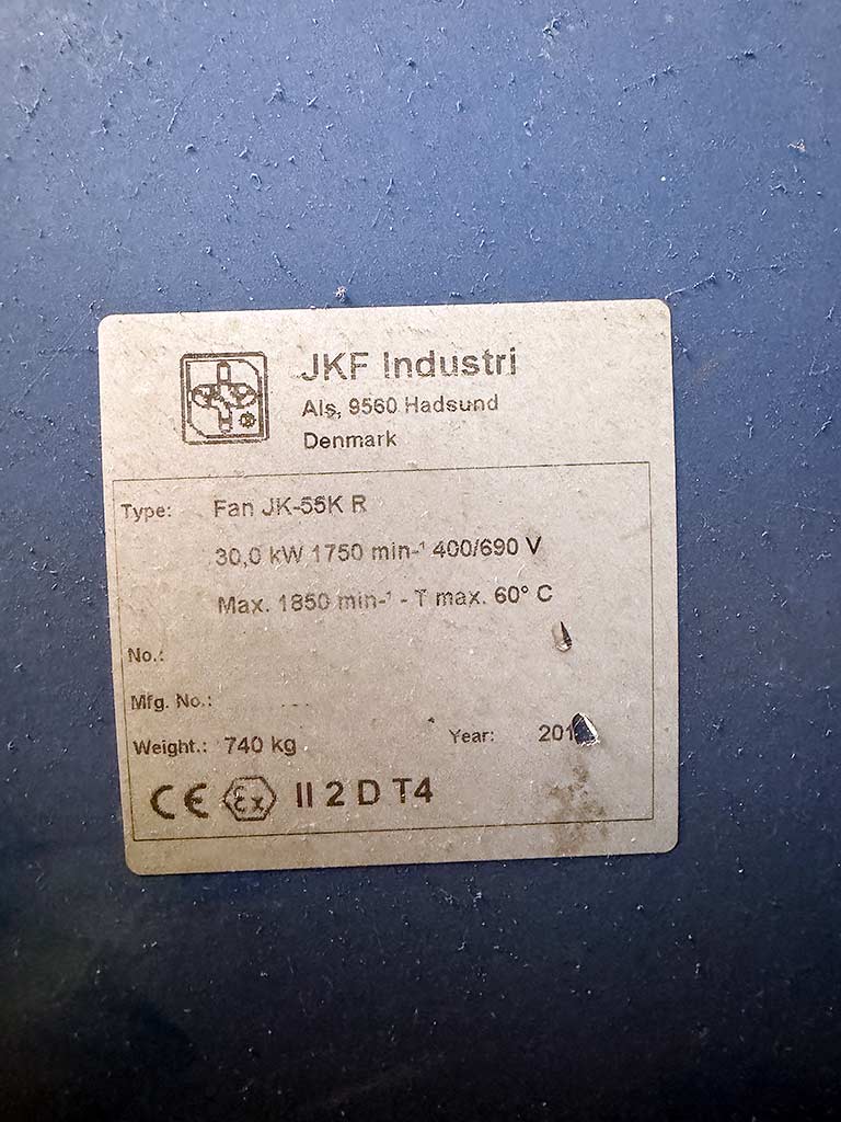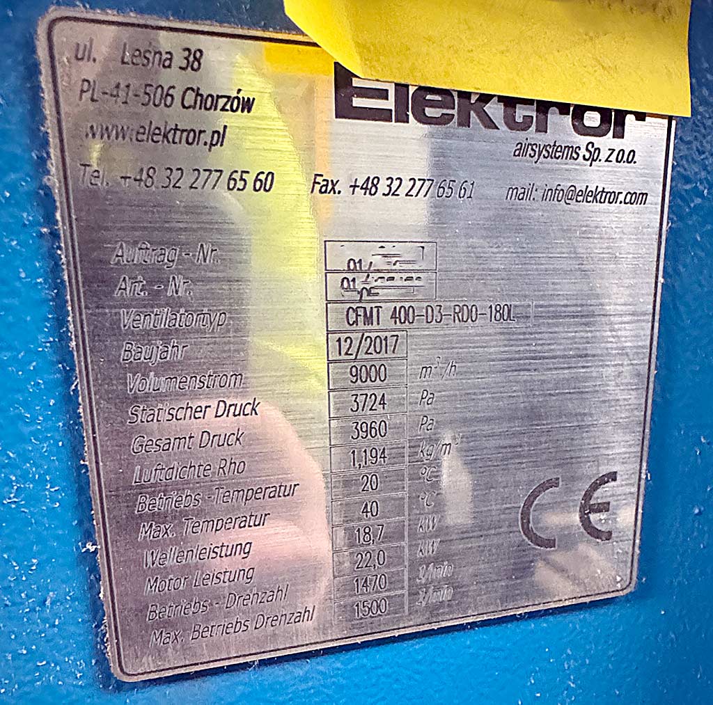 | Beschreibung Zwei Gebläse unterschiedlicher Hersteller stehen zur Verfügung. 1) JKF JK-55K R, Baujahr: ca. 2010, Leistung: 30kW, Drehzahl: 1850U/min, max. Temperatur: 60°C, Gewicht: ca. 740kg. 2) Elektror CFMT 400-D3-RD0-180L, Baujahr: 2017, Volumenstrom: 9000m³/h, statischer Druck: 3724bar, Gesamtdruck: 3960bar, max. Luftdichte: 1,194kg/m³, max. Temperatur: 40°C, max. Betriebsdrehzahl: 1500U/min. Dokumentation vorhanden. Eine Besichtigung vor Ort ist möglich. |