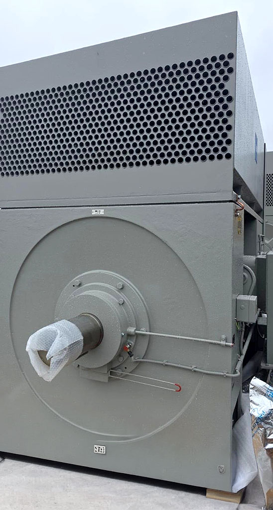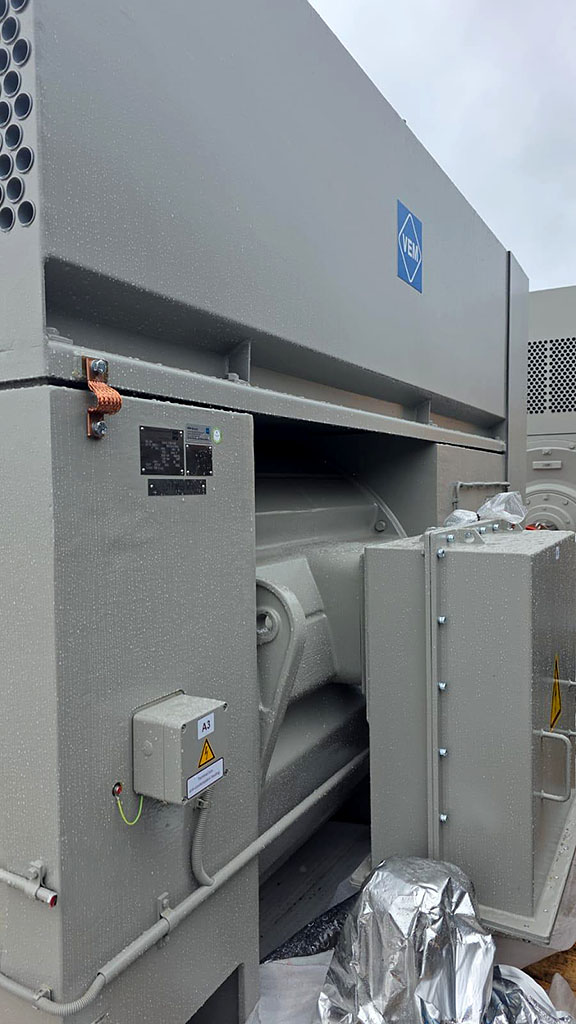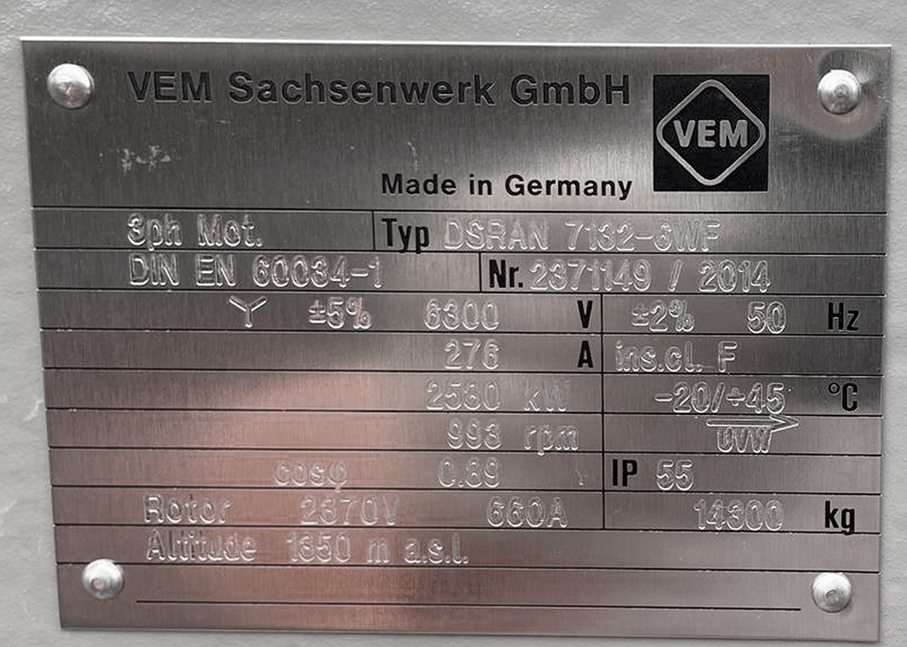 | Beschreibung Ein unbenutzter VEM 6300V Schleifringläufermotor (Asynchronmotor) steht zur Verfügung. Bauform: IM1001, Schutzart: IP55, Isolationsklasse: F, Nennleistung: 2580kW (2,58MW), Nennspannung: 6300V, Nennstrom: 276A, Leistungsfaktor: 0,89, Rotorspannung: 2370V, Rotorstrom: 680A, Nenndrehzahl: 993U/min, Gesamtgewicht: ca. 14300kg. Maschinendimensionen X/Y/Z: ca. 3600mm/2300mm/2320mm. Die Maschine ist unbenutzt und somit neuwertig. Eine Besichtigung nach Absprache vor Ort ist möglich. |