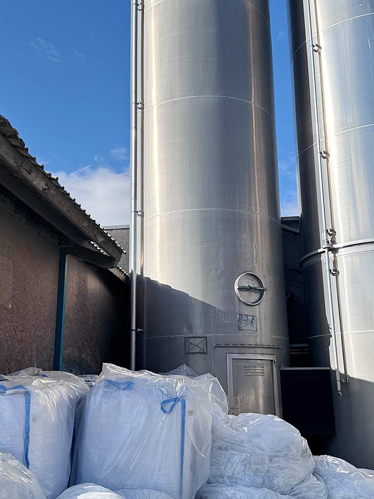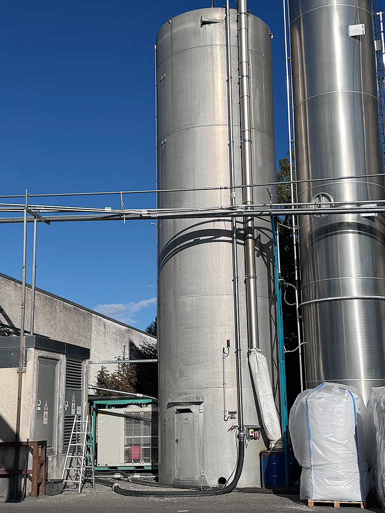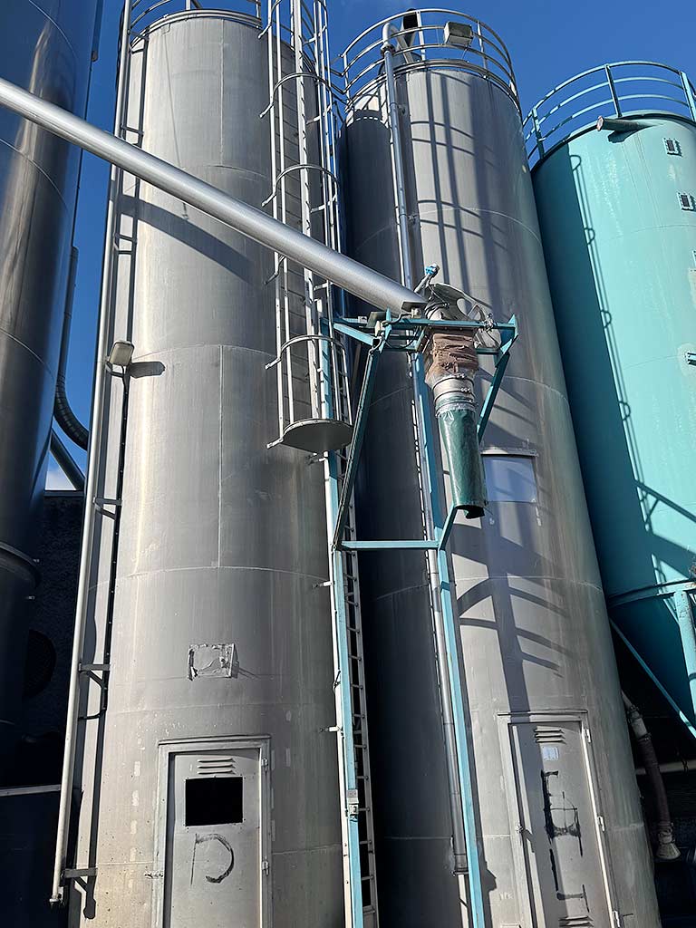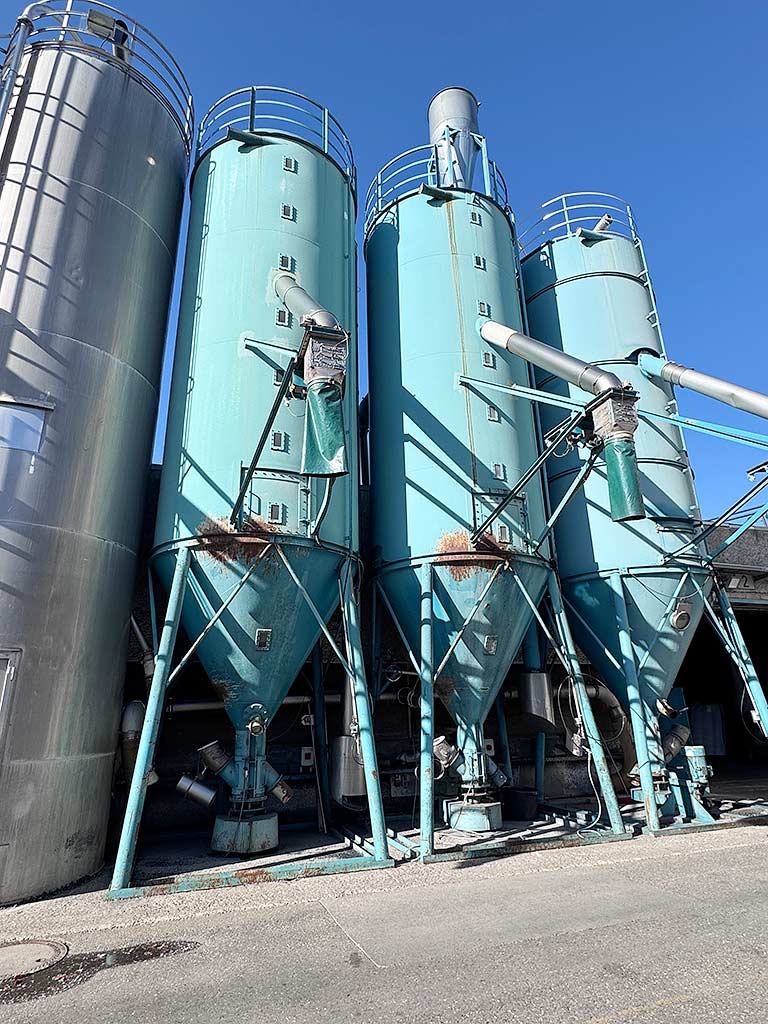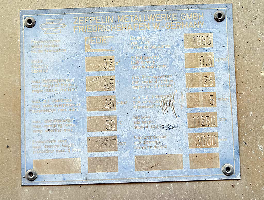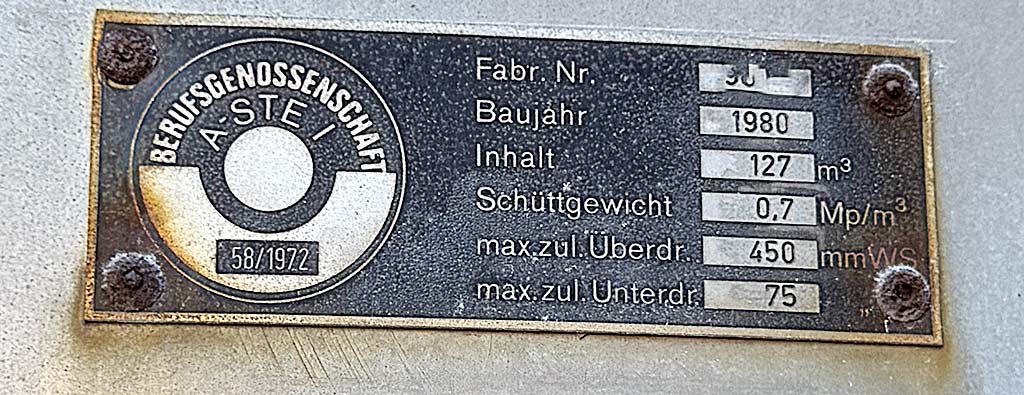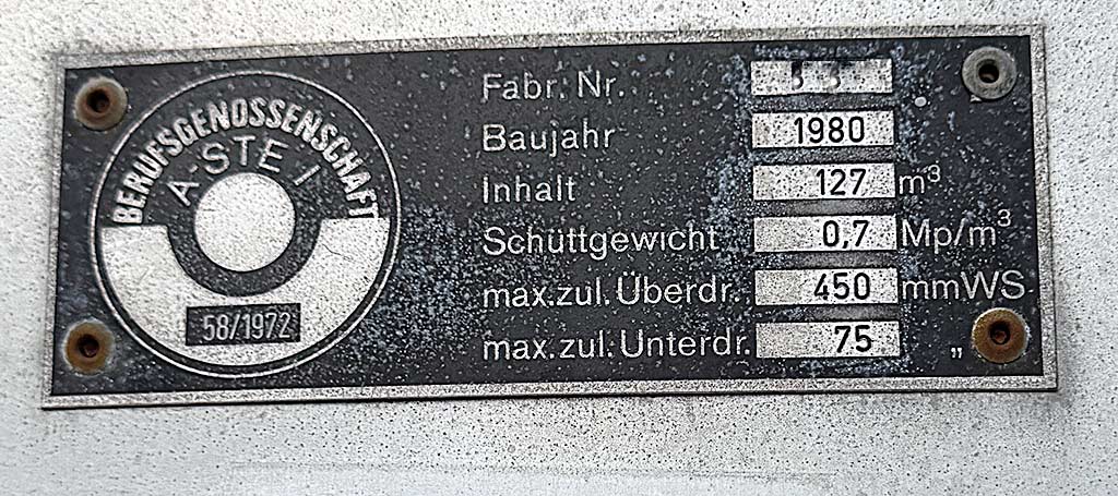 | Beschreibung Diverse Misch- und Lagersilos stehen zur Verfügung. 1) Edelstahlsilo. 2) Edelstahlsilo Zeppelin, Baujahr: 1983, Inhalt: 32m³, Reibungswinkelbereich: 25°-45°, Überdruckbereich: 5mbar-45mbar, max. Betriebstemperatur: 50°C, Schüttgewicht: 0,6kg/dm³, Silohöhe: 11250mm, Silodurchmesser: 3000mm. 3) Edelstahlsilo. 4) 3x baugleiche HD-PE-Mischsilos, Gesamthöhe: ca. 10500mm, Durchmesser: 3000mm, Volumen: ca. 49,5m³, Mischflöten: NW 150, Motorleistung: 15kW. 5) 2x baugleiche Lagersilos Zeppelin, Baujahr: 1980, Volumen: 127m³, Inhalt: 119m³, Silodurchmesser: 3500mm, Neigungswinkel: 15°, Trichterhöhe: 1680mm, Standzargenhöhe: 3700mm, Gesamthöhe: 17500mm. Dokumentation vorhanden. Eine Besichtigung vor Ort ist möglich. Einzelverkauf möglich. |