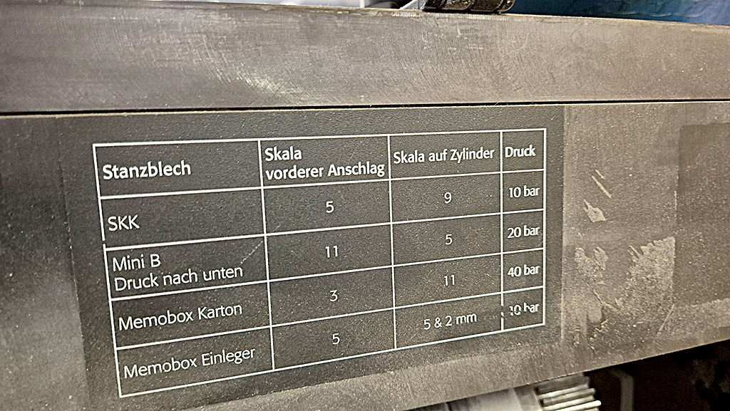 | Beschreibung Angeboten wird eine Kocher + Beck Rotationsstanze/Rotationsstanztechnik. SKK: Skala vorderer Anschlag 5, Skala auf Zylinder 9, 10bar, Mini B (Druck nach unten): Skala vorderer Anschlag 11, Skala auf Zylinder 5, 20bar, Memobox Karton: Skala vorderer Anschlag 3, Skala auf Zylinder 11, 40bar, Memobox Einleger: Skala vorderer Anschlag 5, Skala auf Zylinder 5 & 2mm, 10bar. Besichtigung nach Absprache möglich. |