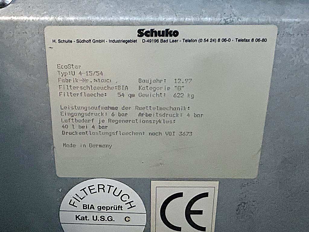 | Beschreibung Eine komplette Absaug- und Filteranlage Schuko steht zur Verfügung. Filterschläuche: BIA, Kategorie: B, Filterfläche: 54m², Eingangsdruck: 6bar, Arbeitsdruck: 4bar, Luftbedarf pro Regeneratzyklus bei 4bar: 40l, Gewicht: ca. 630kg. Eine Besichtigung vor Ort ist möglich. |