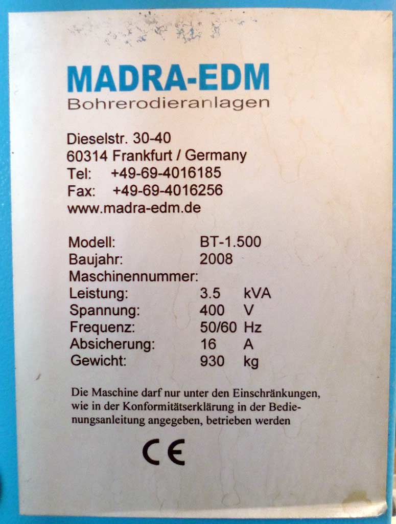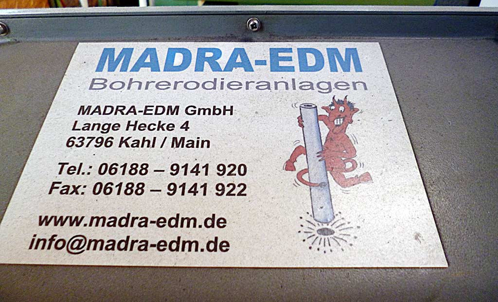 | Beschreibung Eine Startlochbohrmaschine Madra-EDM steht zur Verfügung. Aufspanndimensionen X/Y: 600mm/400mm, max. Werkstückhöhe: 300mm, Verfahrweg X/Y: 500mm/400mm, Verfahrweg W: 250mm, Verfahrweg Z: 0,01mm-380mm, max. Elektrodenlänge: 400mm, max. Werkstückgewicht: 500kg, Bohrungs-Durchmesserbereich: 0,3mm-3mm. Maschinendimensionen X/Y/Z: ca. 1300mm/1300mm/2000mm, Gewicht: ca. 1000kg. Die Elektronik der Maschine ist defekt, da der Strom für den Erodiervorgang nicht bereitgestellt wird. Dokumentation vorhanden. Eine Besichtigung vor Ort ist möglich. |