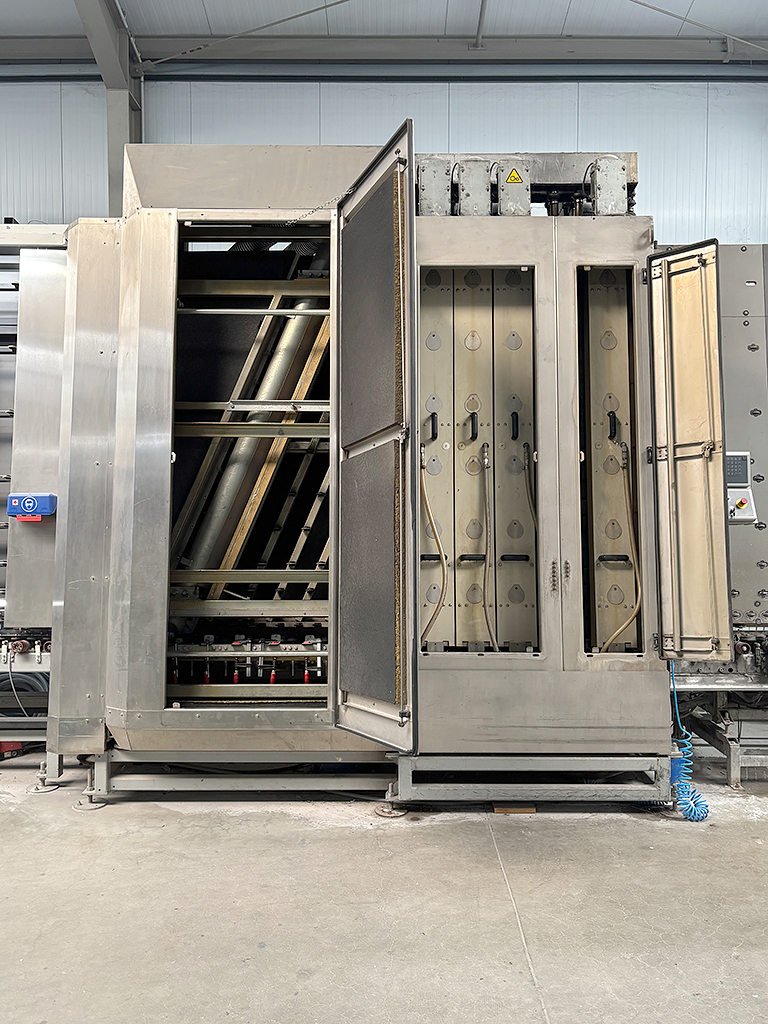 | Beschreibung Angeboten wird eine vertikale Wasch- und Trockenanlage für Flachglas: 3 Reinigungszonen, 6 Walzenbürsten, Trockenzone (Warmluft), Warmwasseraufbereitung (Heizwanne), Quarzsandfilter, Kreislaufsystem, geeignet: Floatglas, Verbundglas, Belastung: 150kg/m², Glasdicke: bis 15mm, Arbeitshöhe: ca. 2000mm. Besichtigung nach Absprache möglich. |