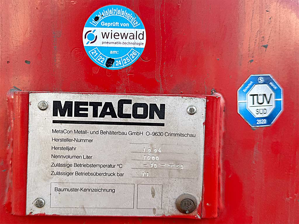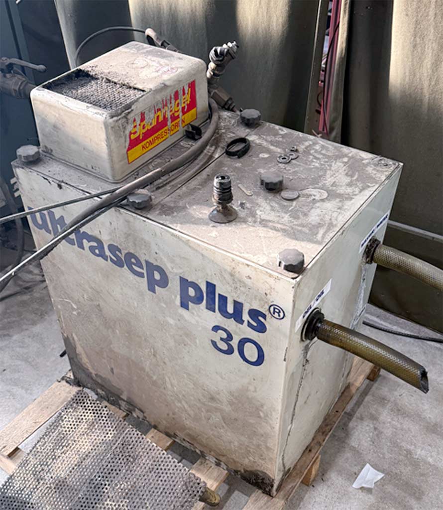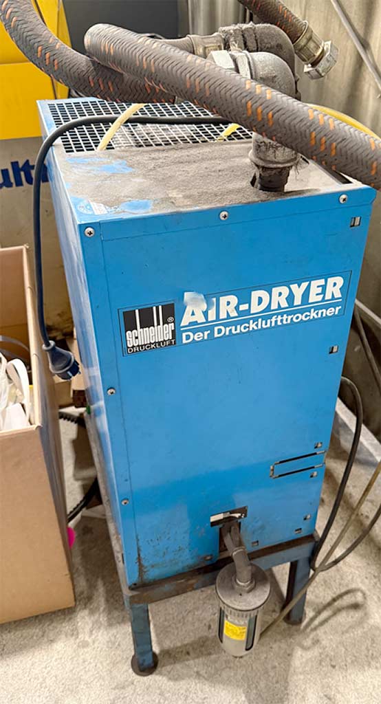 | Beschreibung Ein kleines Kompressorsystem inklusive Abscheider, Trockner und Tank steht zur Verfügung. 1) Druckluftbehälter MetaCon, Baujahr: 1994, Nennvolumen: 1000l, Betriebstemperaturbereich: -10°C/50°C, max. Betriebsüberdruck: 11bar. 2) Kompressor Atlas Copco GA 18, Baujahr: 1994, Luftvolumenstrom: 36,4l/s, max. Betriebsdruck: 10bar, Motorleistung: 18,5kW, Drehzahl: 1500U/min. 3) Lufttrockner Schneider Druckluft GmbH DK 3000 N, max. Eintrittstemperatur: 50°C, max. Betriebsdruck: 16bar, Kältemittel: R134a, Kältemittel-Füllmenge: 700g, Betriebsüberdruck: 17bar. 4) Öl-Wasser-Separator Donaldson Ultrasep Plus 30, max. Restölgehalt: 10mg/l, max. Kompressorkapazität: 30m³/min, Öl-Adsorptionskapazität: 25l, Maschinendimensionen X/Y/Z: ca. 900mm/1000mm/400mm, Gewicht: ca. 70kg. Eine Besichtigung vor Ort ist möglich. |