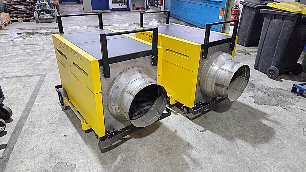 | Beschreibung Zwei mobile industrielle Luftreiniger Trotec, die nur einmal zum Einsatz gekommen sind, stehen zur Verfügung. Luftvolumenstrom: 5700m³/h, Unterdruck: 1150Pa, Luftmenge für Filterklasse H: 3000m³/h, min. Filterfläche bei H13: 26m², Öffnungsdurchmesser: 380mm. Maschinendimensionen X/Y/Z: ca. 1300mm/800mm/1050mm, Gewicht: ca. 150kg. Dokumentation vorhanden. Eine Besichtigung vor Ort ist möglich. |