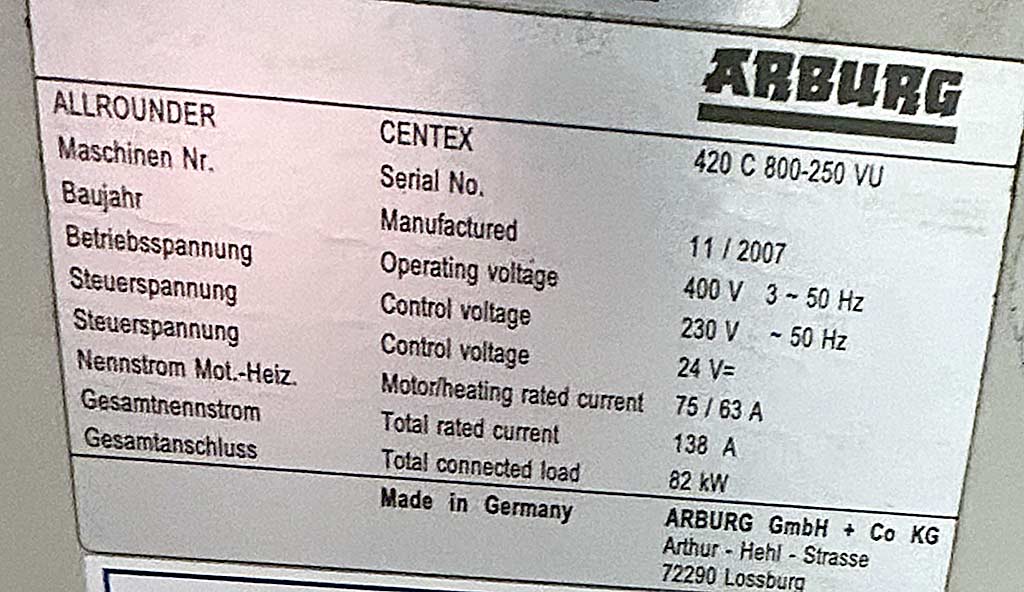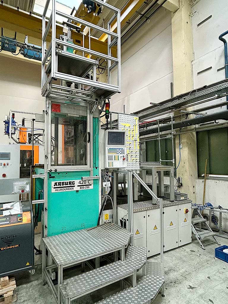 | Beschreibung Eine vertikale Spritzgießmaschine Arburg mit einer horizontalen Spritzeinheit steht zur Verfügung. Schließkraft: 800kN, Öffnungsweg: 500mm, min. Werkzeugeinbauhöhe: 250mm, Aufspannplattenabstand: 750mm, Säulenabstand X/Y: 420mm/420mm, Plattendimensionen X/Y: 570mm/570mm, max. Werkzeuggewicht: 600kg, Auswerferweg: 175mm. Maschinendimensionen X/Y/Z: ca. 4350mm/1700mm/2100mm, Gewicht: ca. 3500kg. Dokumentation vorhanden. Eine Besichtigung vor Ort ist möglich. |
