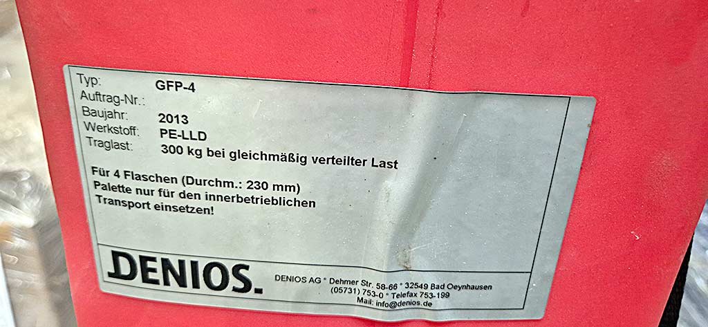 | Beschreibung Eine Gasflaschen-Transportpalette Denios steht zur Verfügung. Flaschenanzahl: 4, max. Flaschendurchmesser: 230mm, Traglast: 300kg, max. Flaschenvolumen: 50l, Werkstoff: PE-LLD, Gabeltaschenbreite: 170mm, Gabeltaschenhöhe: 80mm, Dimensionen X/Y/Z: ca. 1150mm/600mm/1100mm, Gewicht: ca. 30kg. Eine Besichtigung vor Ort ist möglich. |