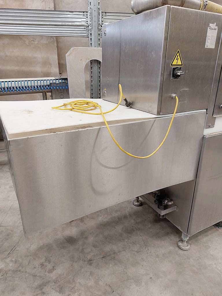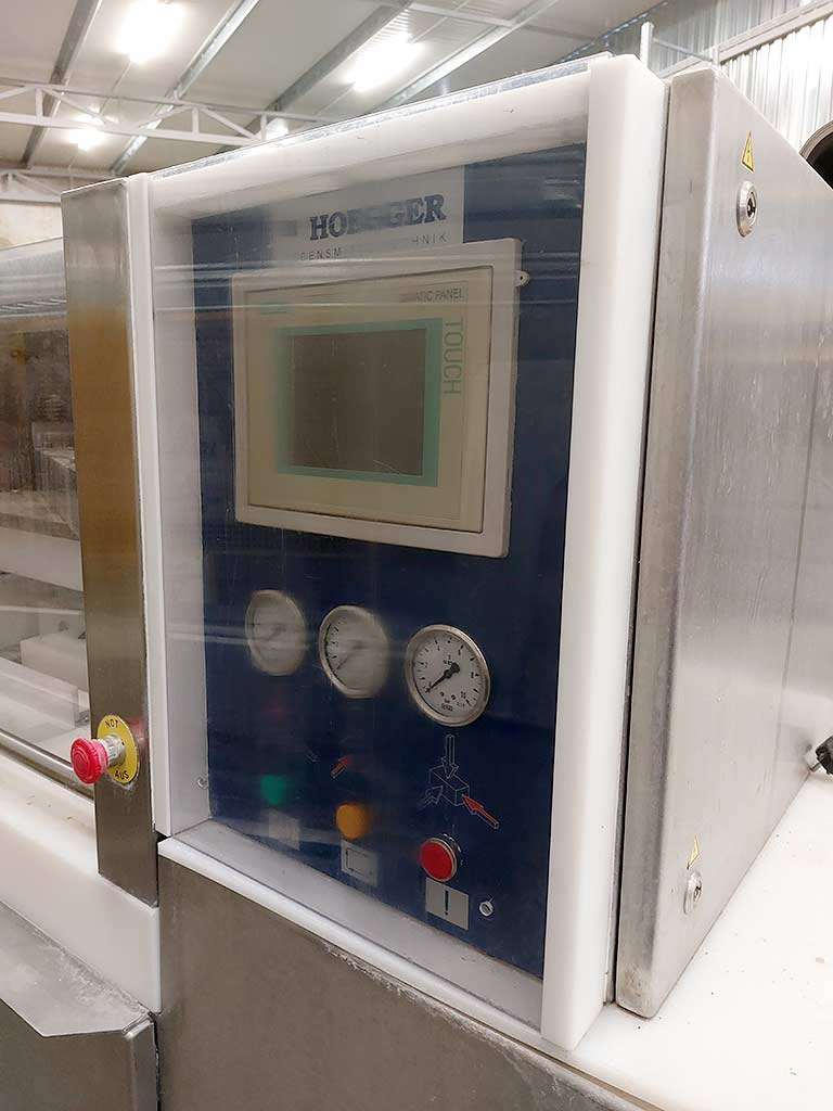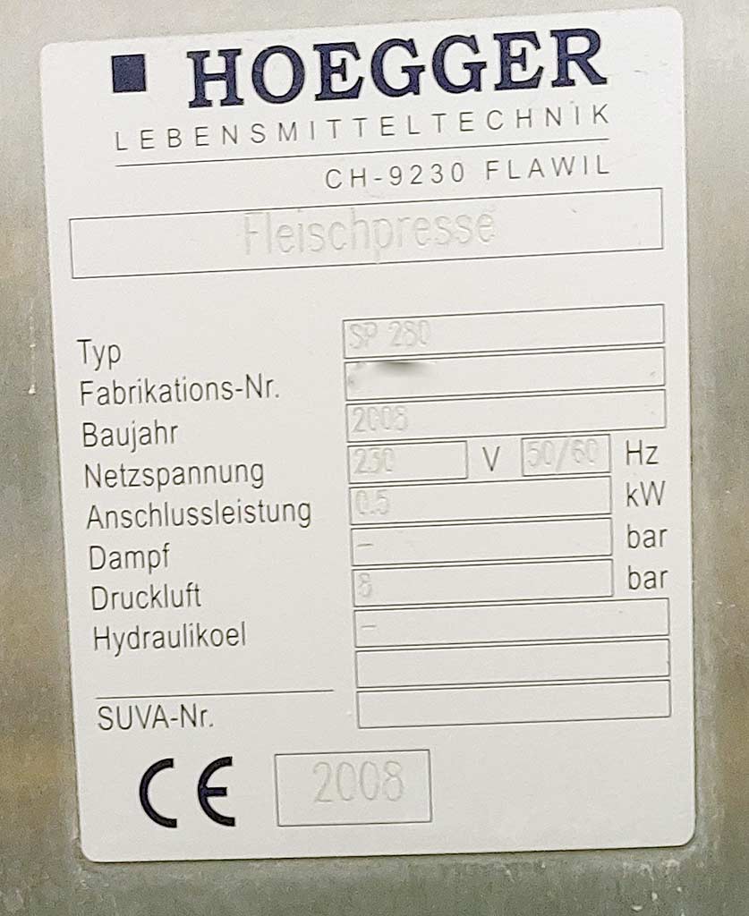 | Beschreibung Eine Speck- bzw. Fleischformpresse Hoegger steht zur Verfügung. Taktleistung: ca. 5/min, max. Produktdimensionen X/Y/Z: 720mm/280mm/120mm, Betriebsdruck: 8bar. Maschinendimensionen X/Y/Z: ca. 2600mm/900mm/2000mm, Gewicht: ca. 2000kg. Dokumentation vorhanden. Eine Besichtigung vor Ort ist möglich. |