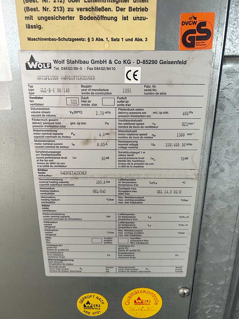 | Beschreibung Zwei begehbare Klimaschränke inklusive Brenner Wolf stehen zur Verfügung. Wärmeleistung: 105kW, Heizmedium: Öl/Gas, max. Öldurchsatz: 14,9kg/h, Luftvolumenstrom: 2,78m³/h, max. externer Förderdruck: 400Pa, Steuerung: SPS. Dokumentation vorhanden. Eine Besichtigung vor Ort ist möglich. |
