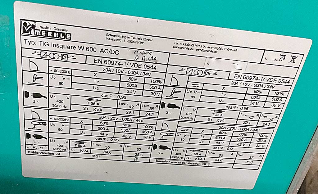 | Beschreibung Eine Industrie-TIG-Schweißstromquelle Merkle in AC/DC-Ausführung steht zur Verfügung. Isolationsklasse: S, Kühlung: AF, Spannung: 400V, Leistungsfaktor: 0,95. Dokumentation vorhanden. Eine Besichtigung vor Ort ist möglich. |