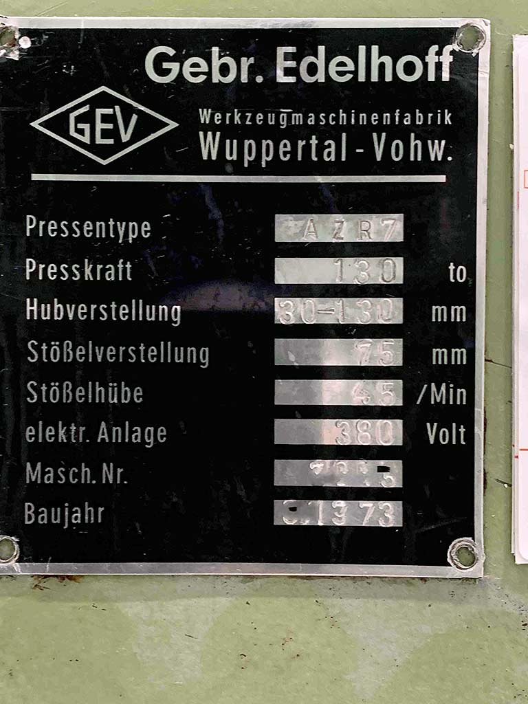 | Beschreibung Eine Einständer-Exzenterpresse Edelhoff inklusive Transfereinheit steht zur Verfügung. Presskraft: 130t, Hubverstellung: 30mm-130mm, Stößelverstellung: 75mm, Hubzahl: 45/min, Tischdimensionen X/Y: 1000mm/700mm, Gewicht: ca. 5000kg. Eine Besichtigung vor Ort ist möglich. |