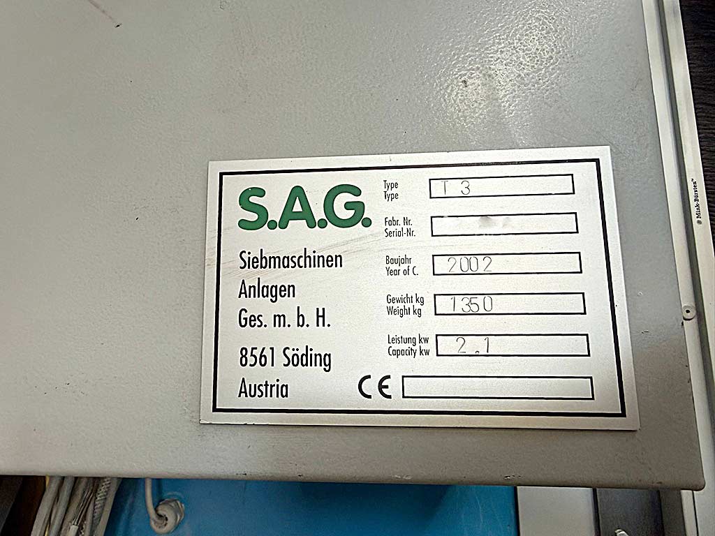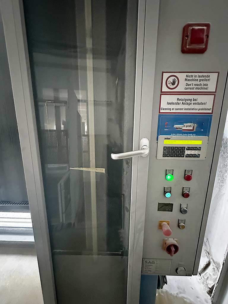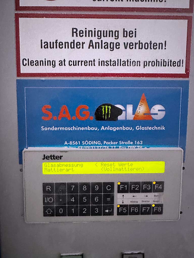 Zwei Glassandstrahlanlagen des Fa. S.A.G. stehen zur Verfügung. 1) S.A.G. T4, Baujahr: 2005, Anordnung: vertikal, max. Strahlbreite: 3000mm, max. Strahlhöhe: 2250mm, max. Glashöhe: 2400mm, Glasstärkenbereich: 3mm-40mm, Strahlleistung: ca. 15m²/h, Maschinendimensionen X/Y/Z: ca. 3800mm/3300mm/1900mm, Gewicht: ca. 1550kg. 2) S.A.G. T3, Baujahr: 2002, Strahlbreite: 2800mm, Strahlhöhe: 1200mm, Glasstärkenbereich: 3mm-40mm, Maschinendimensionen X/Y/Z: ca. 4100mm/2300mm/1900mm, Gewicht: ca. 1350kg. Dokumentation vorhanden. Eine Besichtigung vor Ort ist möglich.