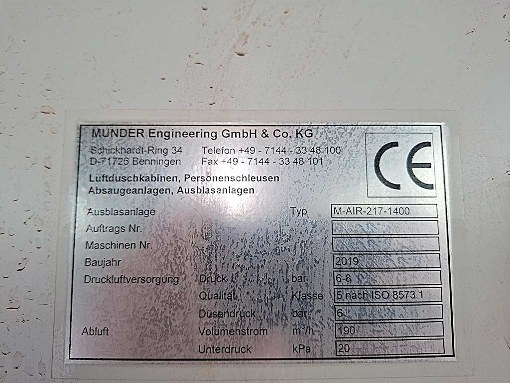| Beschreibung Eine automatische Ausblasanlage Munder zur Reinigung von zylindrischen Luftfilterpatronen steht zur Verfügung. Druckluftversorgung: 6bar-8bar, Qualität: 5, Düsendruck: 6bar, Volumenstrom: 190m³/h, Unterdruck: 20kPa, max. Filterhöhe: 1400mm, max. Filterdurchmesser: 540mm. Dokumentation vorhanden. Eine Besichtigung vor Ort ist möglich. |
