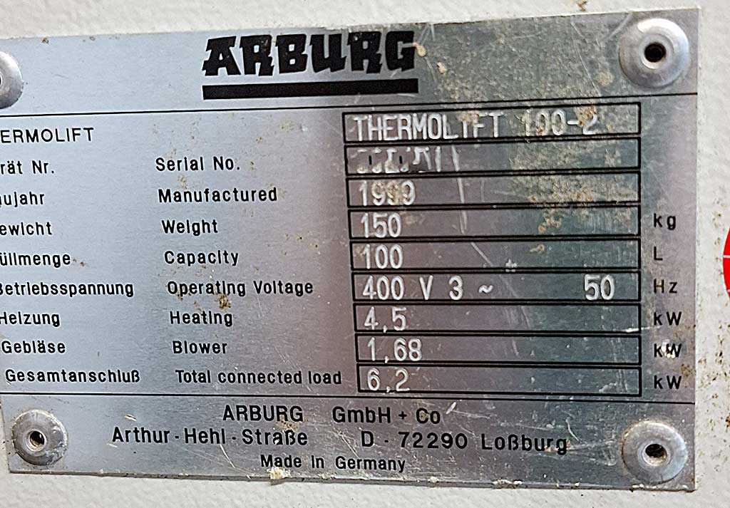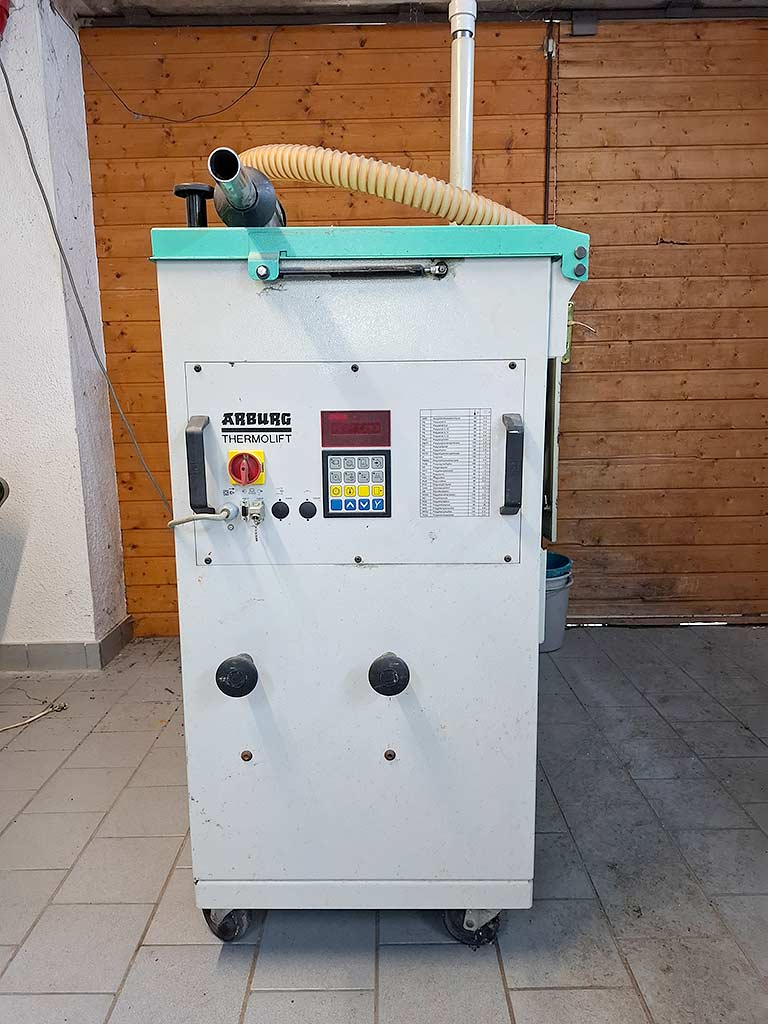 | Beschreibung Ein Kunststoffgranulattrockner Arburg mit integrierter Materialförderung steht zur Verfügung. Trichtervolumen: 100l, max. Trocknungstemperatur: 150°C, Heizleistung: 4,5kW, Luftleistung: 90m³/h, Förderhöhe: ca. 3000mm, Maschinendimensionen X/Y/Z: ca. 950mm/600mm/2000mm, Gewicht: ca. 150kg. Eine Besichtigung vor Ort ist möglich. |