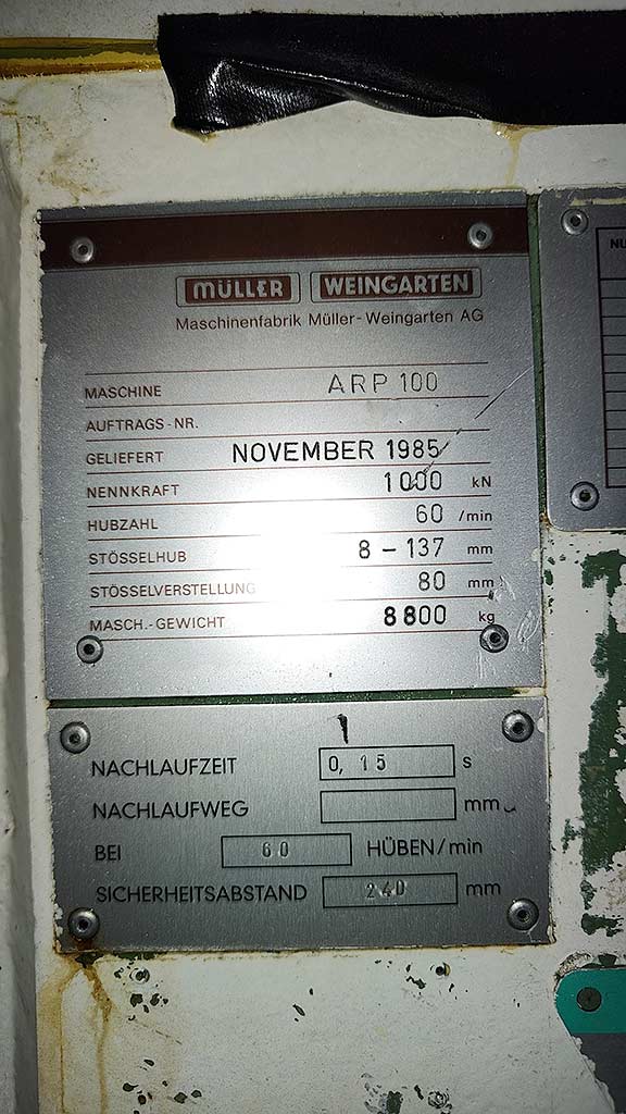 | Beschreibung Presskraft: 100t, Hubzahl: 60/min, Stößelhub: 8mm-137mm, Stößelverstellung: 80mm, Ausladung: 375mm, Tischdimensionen X/Y/Z: 800mm/630mm, Maschinendimensionen X/Y/Z: ca. 1500mm/2400mm/3500mm, Gewicht: ca. 8800kg. Eine Besichtigung vor Ort ist möglich. |