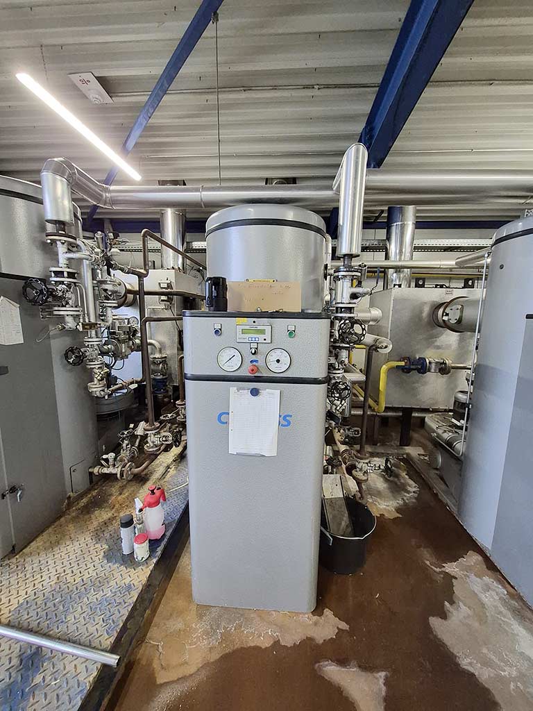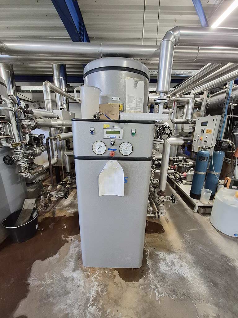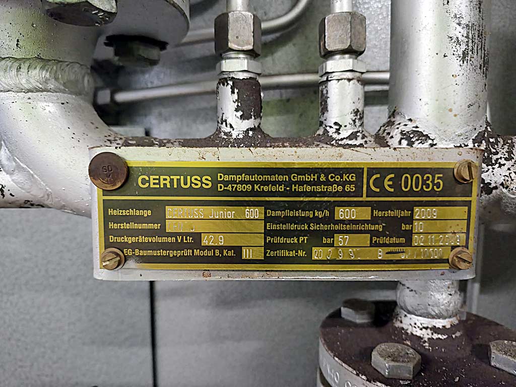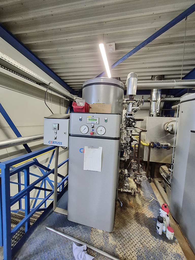| Beschreibung Drei baugleiche Dampferzeuger Certuss stehen zur Verfügung. Baujahr: 2008/2009/2010, Dampfleistung: 600kg/h, Druckgerätevolumen: 42,9l, Einstelldruck: 10bar, Prüfdruck: 57bar. Maschinendimensionen X/Y/Z: 1650mm/900mm/2000mm, Gewicht: ca. 950kg. Dokumentation vorhanden. Eine Besichtigung vor Ort ist möglich. |