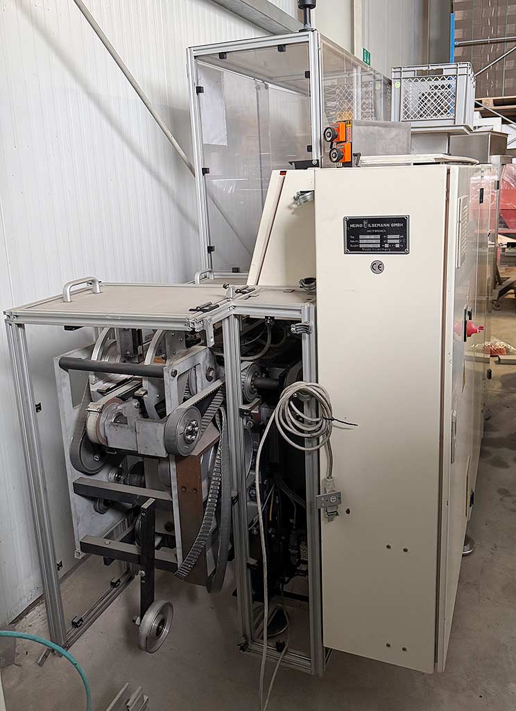 | Beschreibung Eine Folieneinschlagmaschine Heine Ilsemann steht zur Verfügung. Materialien: Polypropylen/Zellophan/PVC/beschichtetes Papier, Leistung: 200Takte/min, Anschlussleistung: 8kW, Maschinendimensionen X/Y/Z: ca. 3500mm/1100mm/2000mm, Gewicht: ca. 2200kg. Eine Besichtigung vor Ort ist möglich. |