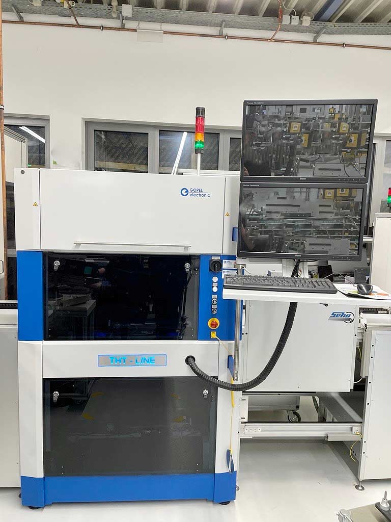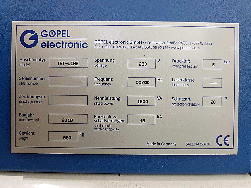 | Beschreibung Eine optische Inspektionsmaschine Göpel zur Inspektion von THT-Bauteilen, THT-Lötstellen und wellengelöteten SMD-Bauelementen steht zur Verfügung. Bauteilfreiheit: 120mm, max. Bauteilhöhe oben/unten: 80mm/10mm, max. Inspektionsdimensionen X/Y: 540mm/450mm, max. Werkstückdimensionen X/Y: 620mm/510mm, Inspektionsgeschwindigkeit: ca. 100cm²/s, Maschinendimensionen X/Y/Z: ca. 1200mm/1400mm/1800mm, Gewicht: ca. 900kg. Dokumentation vorhanden. Eine Besichtigung vor Ort ist möglich. |