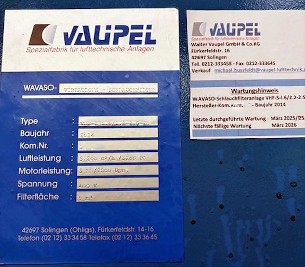 | Beschreibung Eine Vibrations- und Schlauchfilteranlage Vaupel steht zur Verfügung. Luftvolumenstrom: 3200m³/h, Motorleistung: 3kW, Drehzahl: 2300U/min, Filterfläche: 9m². Eine Besichtigung vor Ort ist möglich. |