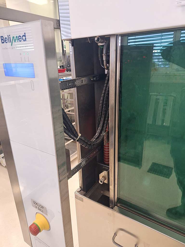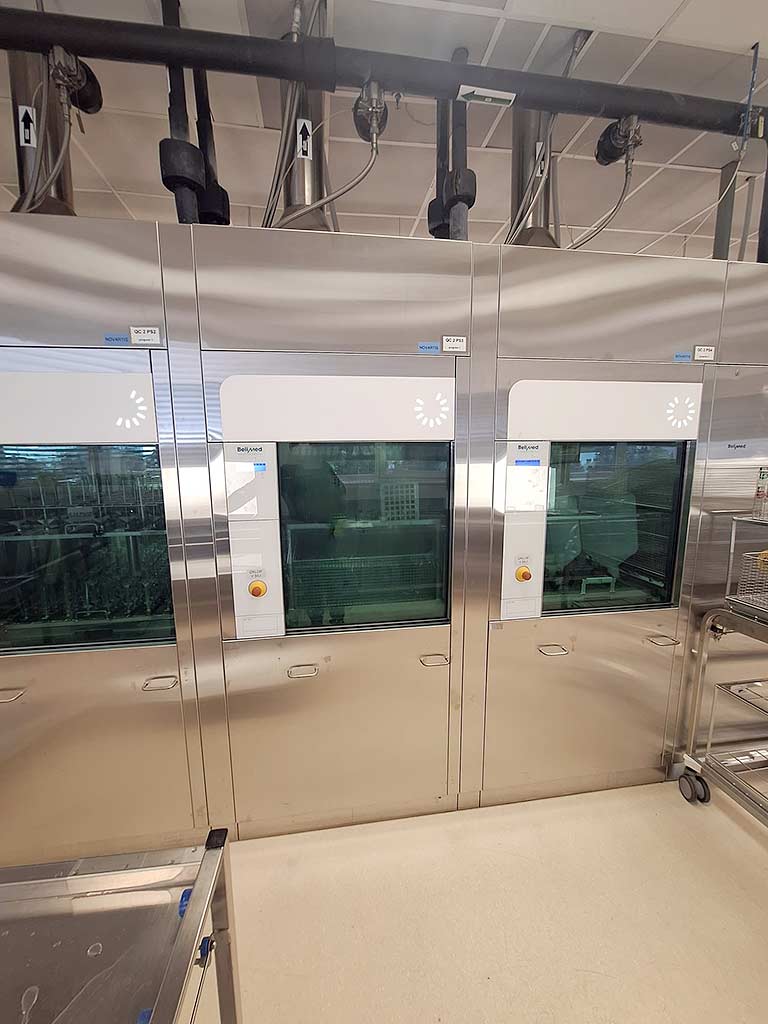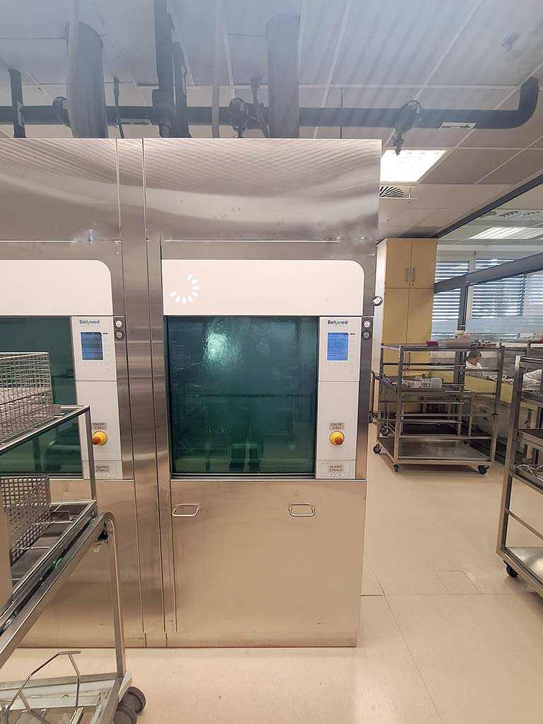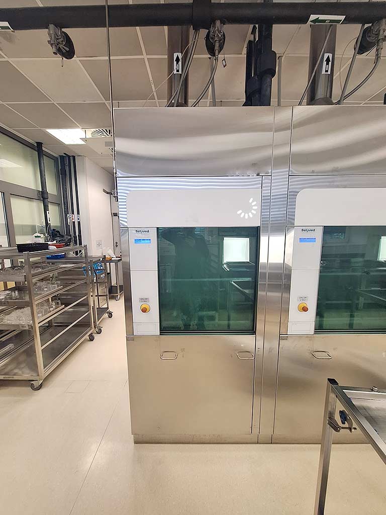 | Beschreibung Zwei Reinigungs- und Desinfektionsgeräte RDG Belimed mit integrierter Trocknung stehen zur Verfügung. Waschkammerdimensionen X/Y/Z: 690mm/630mm/800mm, Nutzvolumen: 350l, Grobfilter: 2mm, Feinfilter: 1,5mm, Trocknungstemperatur: 110°C, Luftfilter: HEPA H13, Abscheidegrad: 99,95%, A0-Desinfektionswert: 3000. Maschinendimensionen X/Y/Z: ca. 1850mm/900mm/950mm, Gewicht: ca. 400kg. Dokumentation vorhanden. Eine Besichtigung vor Ort ist möglich. |