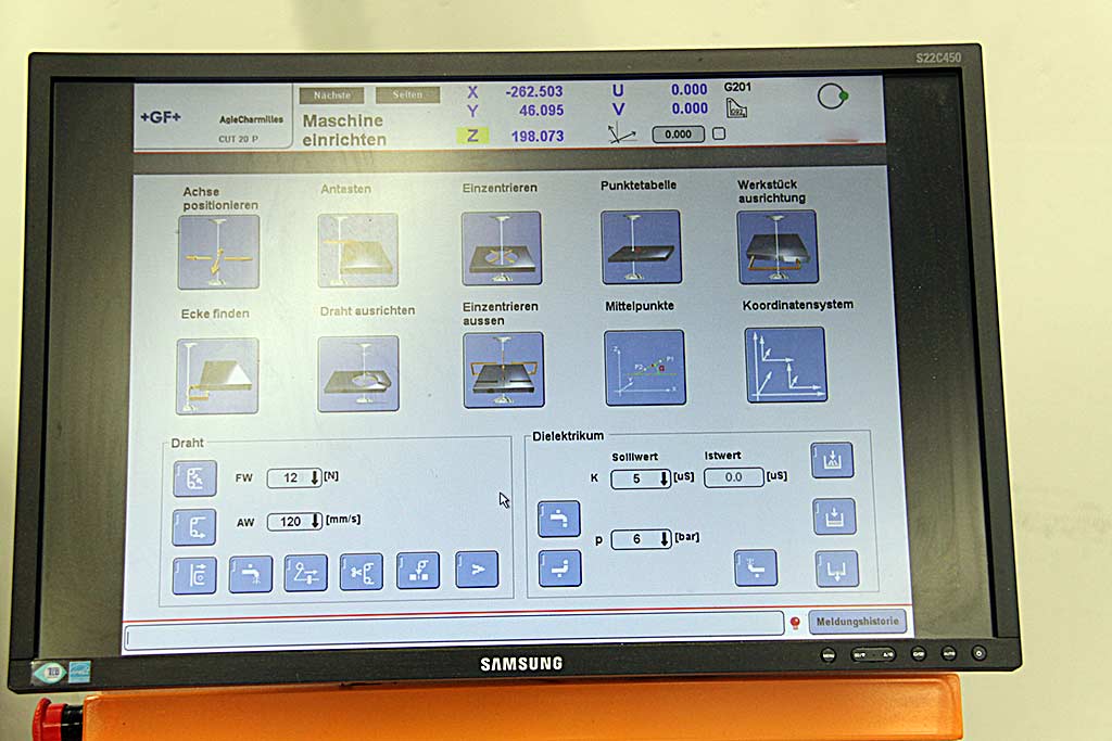 | Beschreibung Achsen: 5, interpolierende Achsen: 4, Verfahrweg X/Y/Z: 350mm/250mm/250mm, Verfahrweg U/V: +/-45mm, Auflösung: 0,1µm, max. Werkstückdimensionen X/Y/Z: 820mm/680mm/250mm, max. Werkstückgewicht: 400kg, Tischdimensionen X/Y: 700mm/480mm, Drahtdurchmesserbereich: 0,1mm-0,3mm, Maschinendimensionen X/Y/Z: ca. 2500mm/2500mm/2200mm, Gewicht: ca. 2700kg, Dokumentation vorhanden, eine Besichtigung vor Ort ist möglich. |