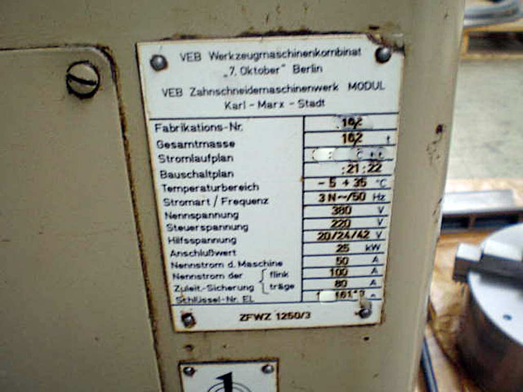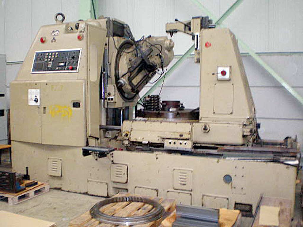 | Beschreibung Radbreite: 600mm, Modulbereich: 2-16, Fräserdimensionen X/Y: 240mm/280mm, Tischdurchmesser: 1020mm, Drehzahl: 200U/min, Schwenkung: +/-45°, max. Raddurchmesser mit/ohne Gegenhalter: 1250mm/800mm. Maschinendimensionen X/Y/Z: ca. 4500mm/2100mm/3300mm, Gewicht: ca. 16200kg. Eine Besichtigung vor Ort ist möglich. |