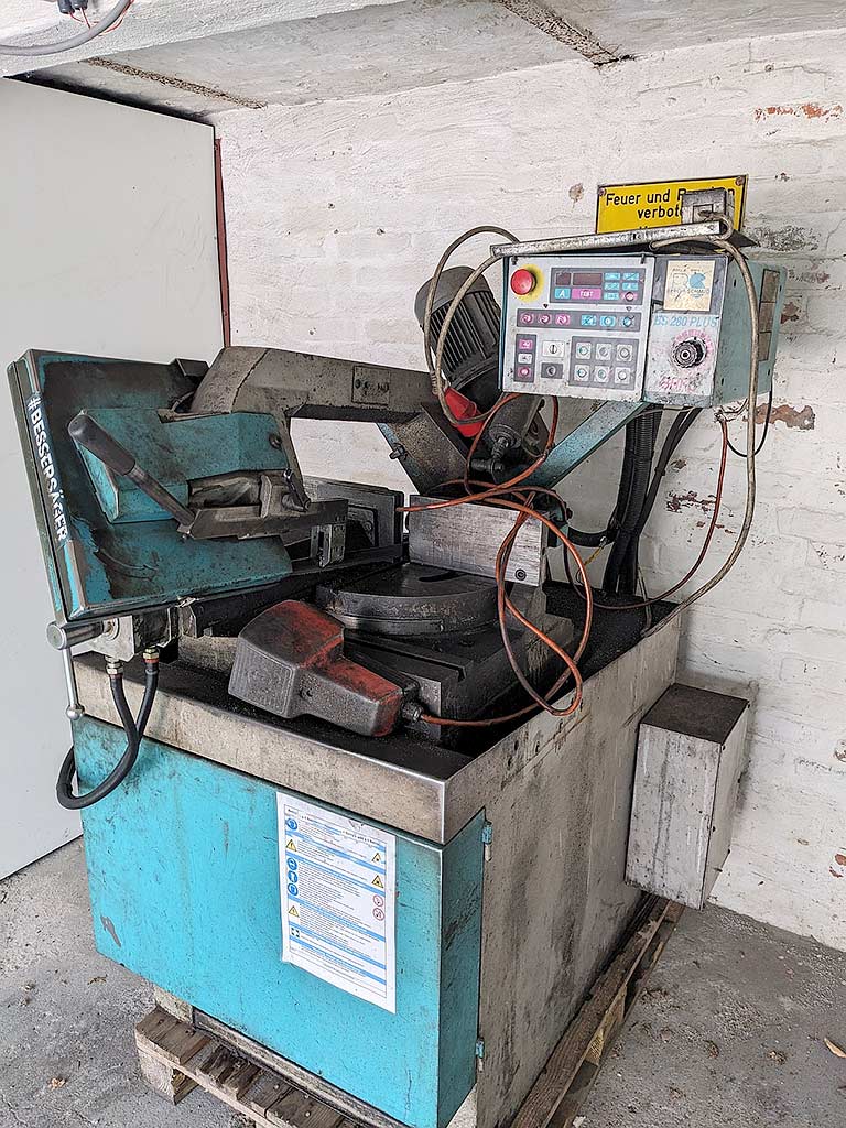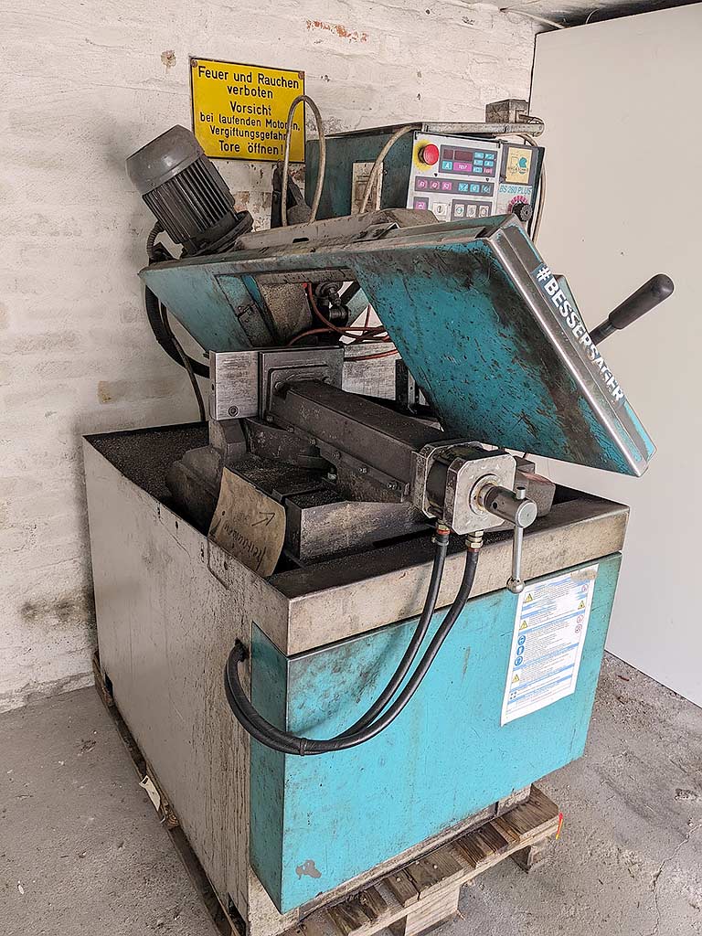 | Beschreibung Corrected German Eine Bandsäge Berg & Schmit in Doppelgehrungsausführung inklusive 20 neuer Sägebänder steht zur Verfügung. Gehrungsbereich: 60°-45°, Schnittgeschwindigkeit: 80m/min, Schnittleistung rund: 230mm, Schnittleistung vierkant: 230mm/230mm, Schnittleistung rechteckig: 280mm/150mm, Maschinendimensionen X/Y/Z: ca. 1600mm/1000mm/1500mm, Gewicht: ca. 350kg. Die Maschine weist eine Hydraulikölleckage auf. Eine Besichtigung vor Ort ist möglich. |
