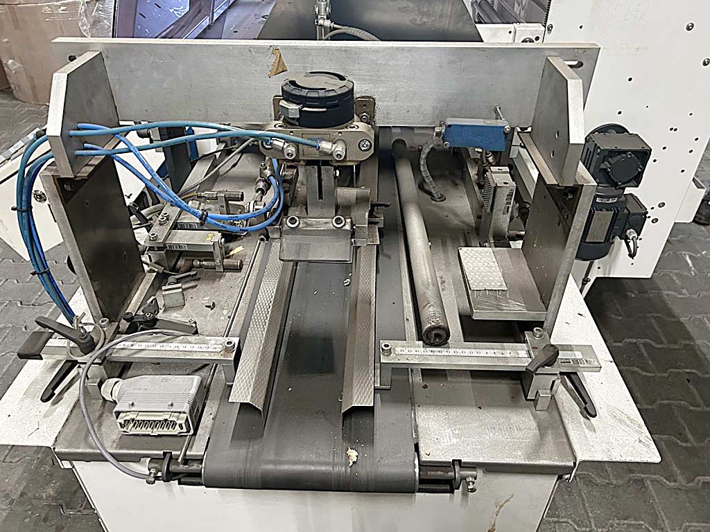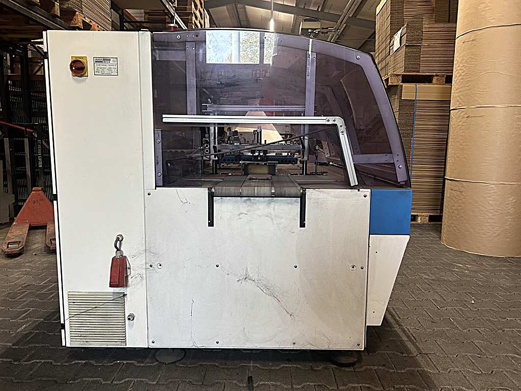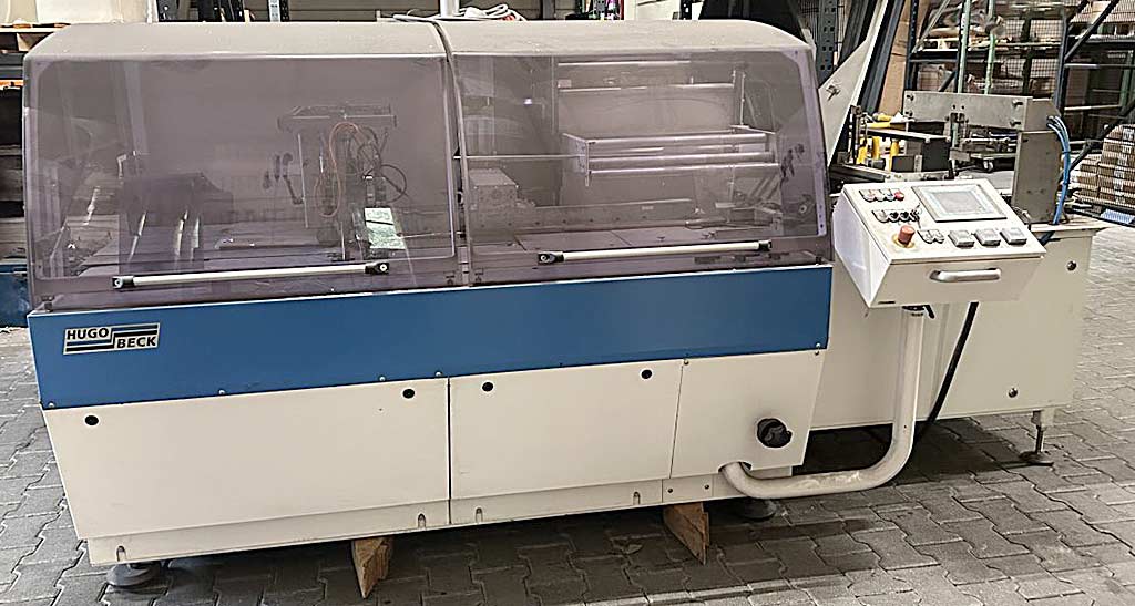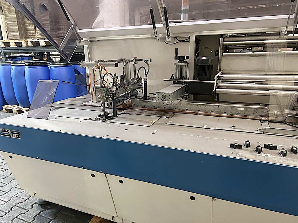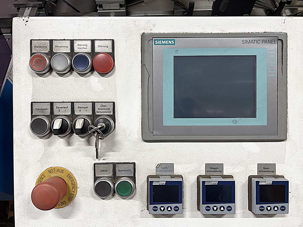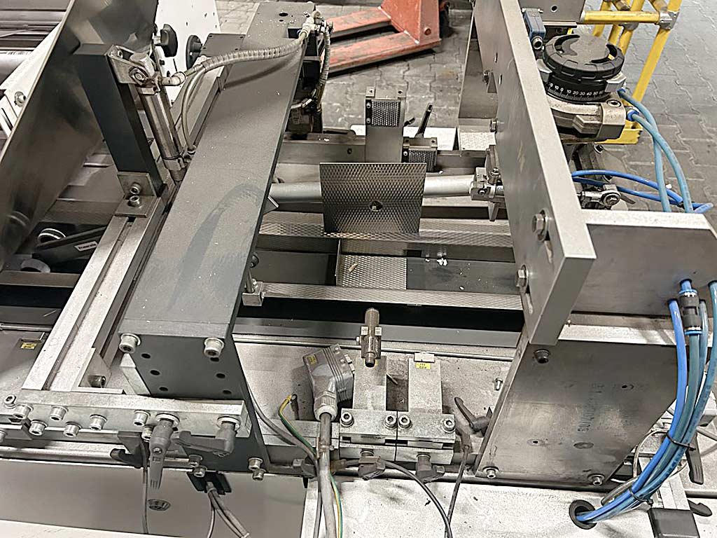 | Beschreibung Eine horizontale Schlauchbeutel-Verpackungsmaschine Hugo Beck steht zur Verfügung. Taktleistung: 5000/h, max. Packgutbreite: 480mm, max. Packguthöhe: 150mm, min. Packgutlänge: 40mm, Arbeitshöhenbereich: 820mm-900mm, max. Rollendurchmesser: 400mm, max. Rollenbreite: 600mm, Rollenmaterialien: PO/PE/PP, Maschinenbreite: ca. 1700mm, Gewicht: ca. 2100kg. Inklusive Folienfaltvorrichtung FF700-IN, Druckbildsteuerung, Siegelschweißung, Überlappungslängsschweißung 10mm-30mm, Pressband und Pressrolle. Dokumentation vorhanden. Eine Besichtigung vor Ort ist möglich. |