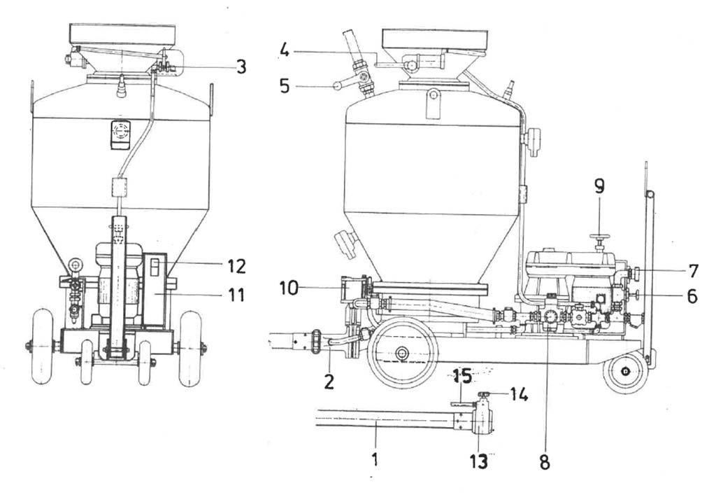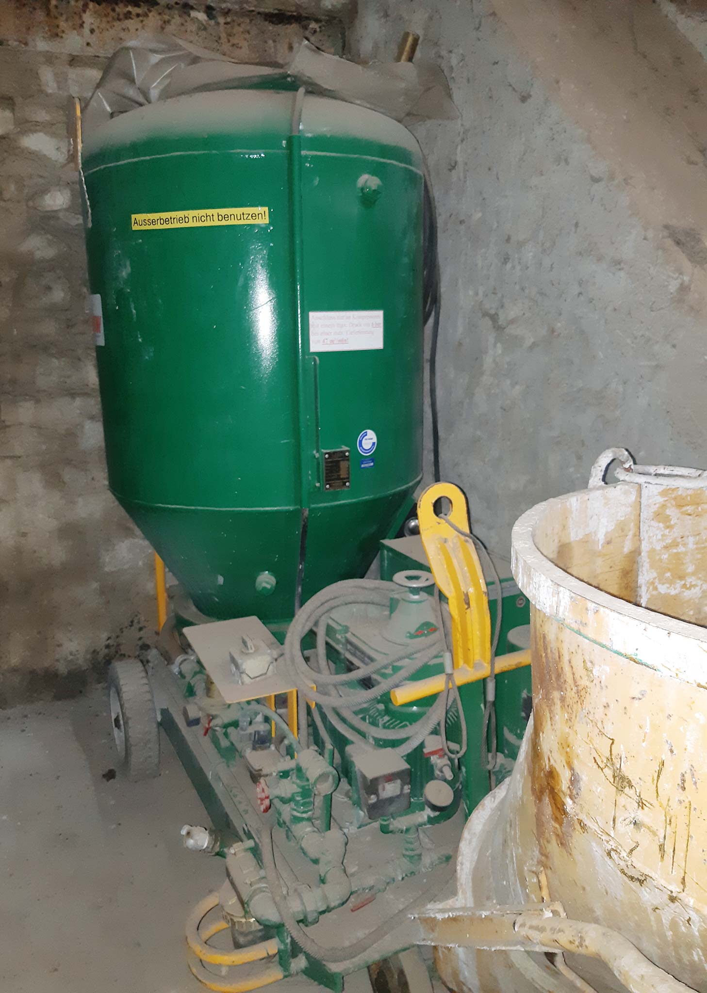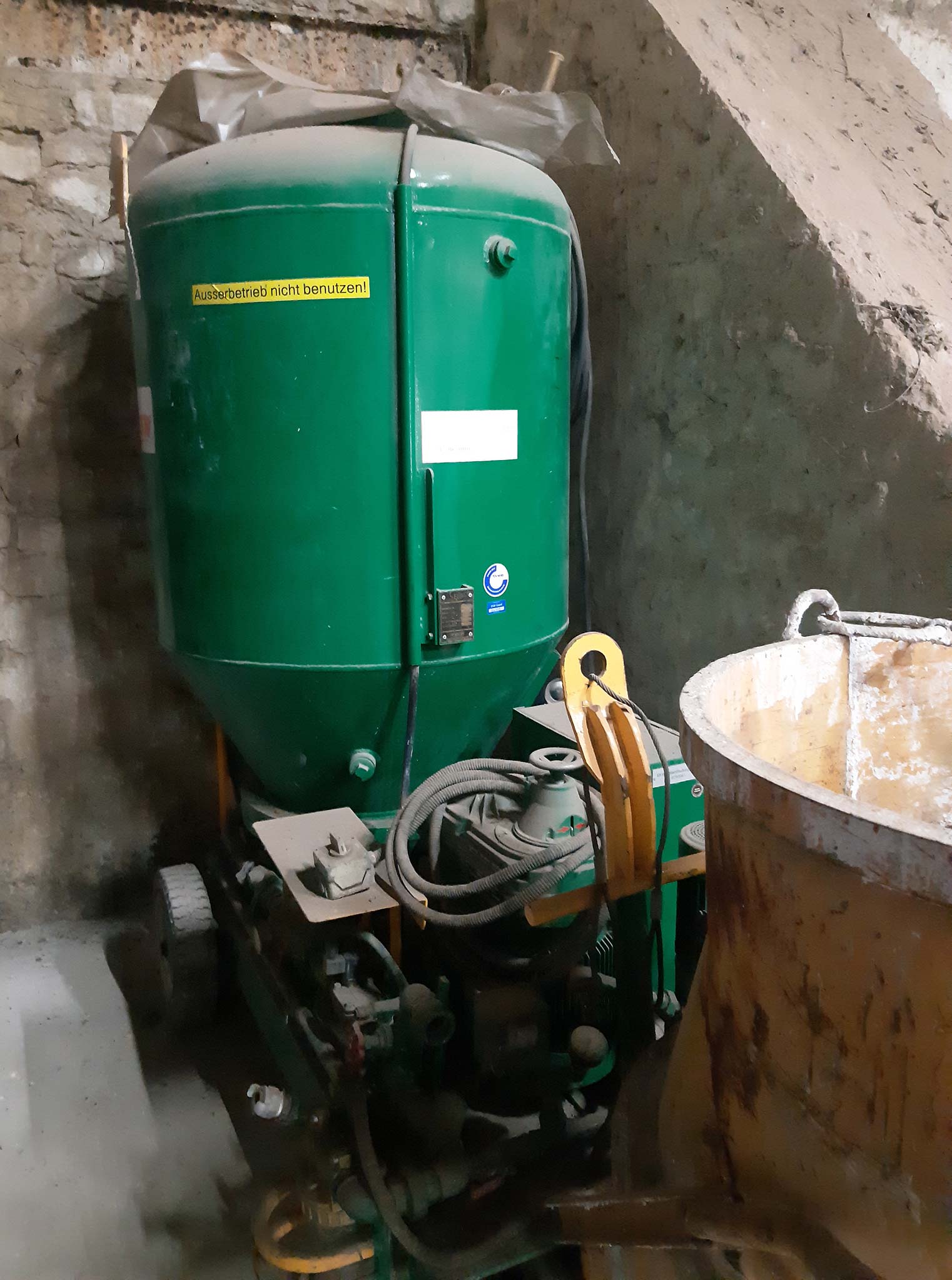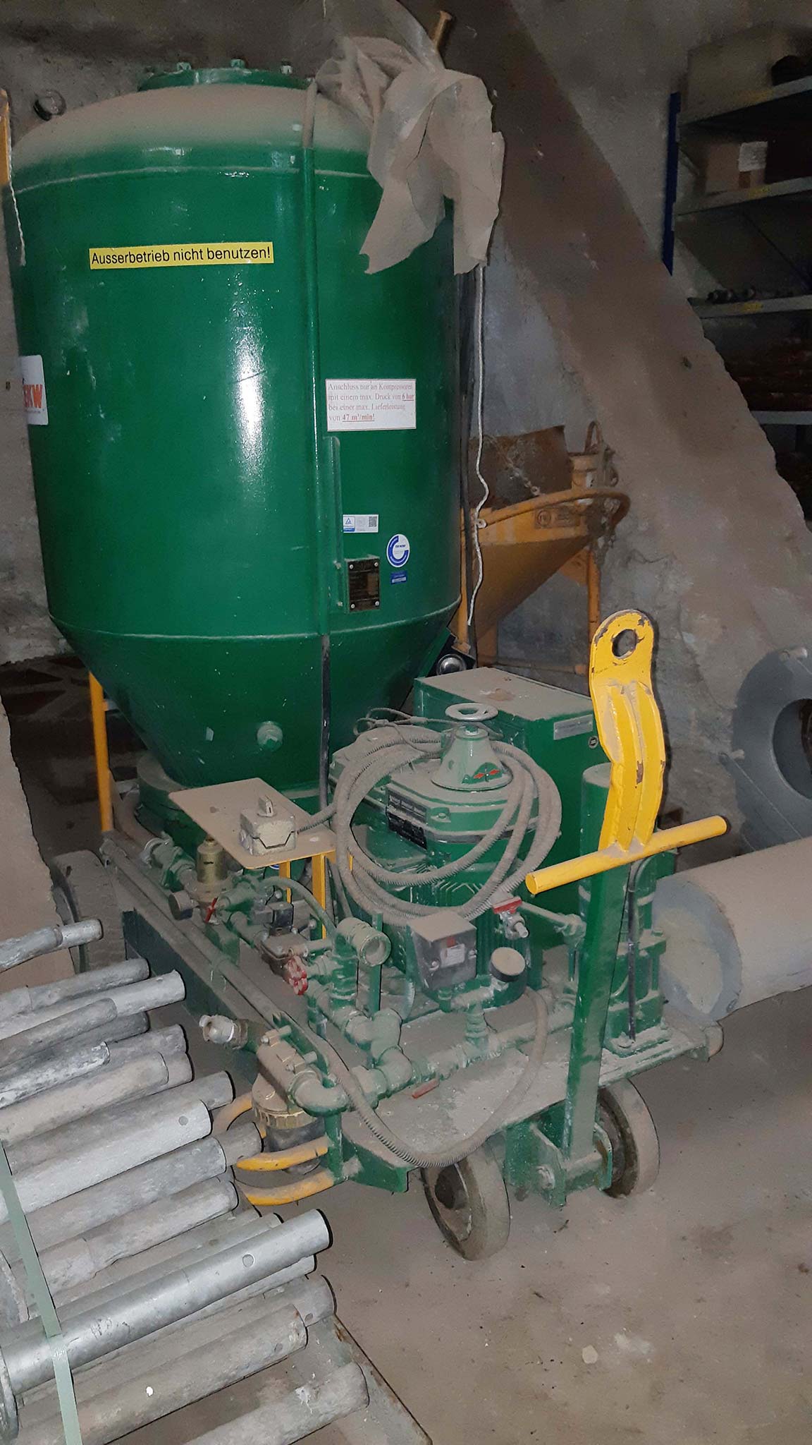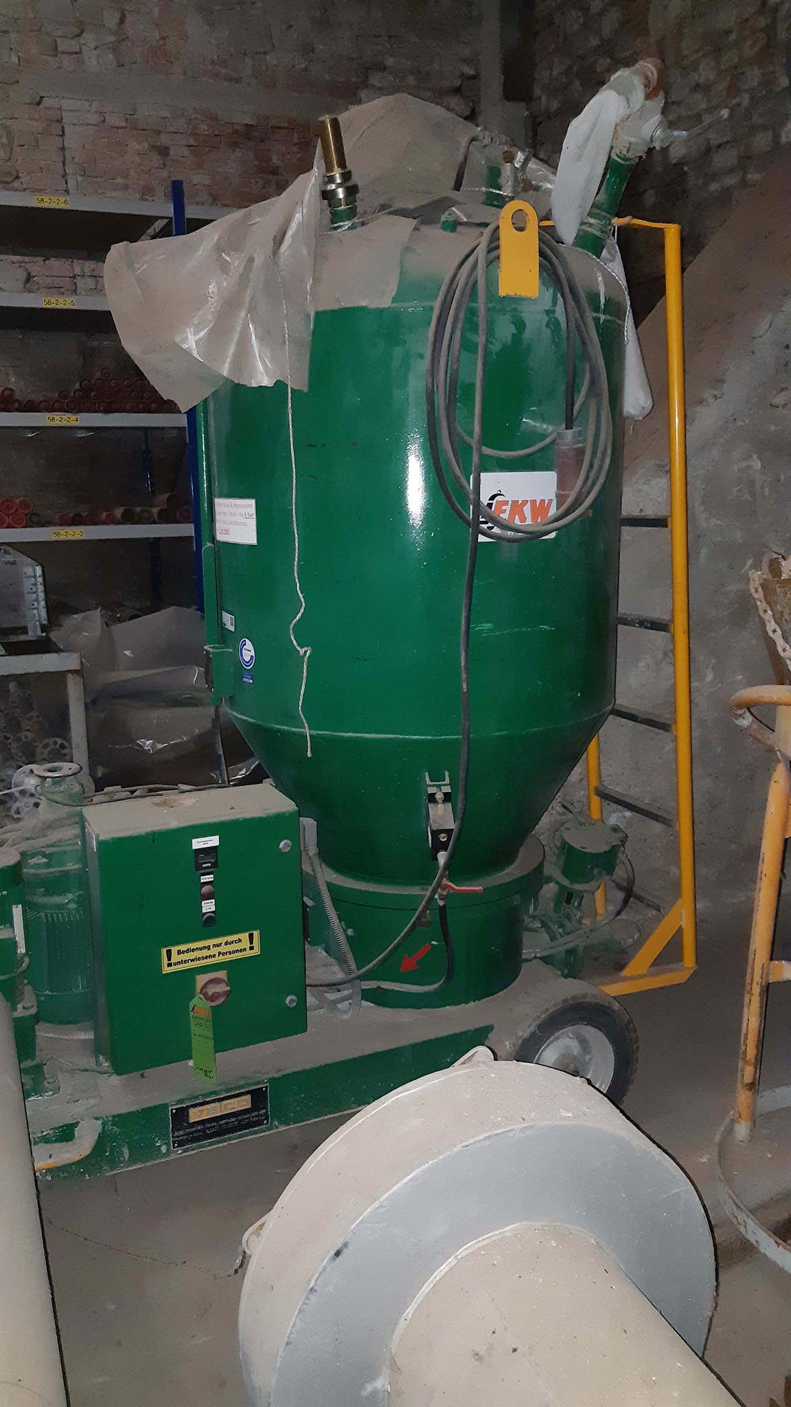 | Description Injection material blowing pressure: 0.5-6bar, Drive: variable gearbox Lenze, Elements: material hose, blow-out nozzle, directional valve, swivel lever, exhaust valve, valve, nozzle, pressure reducer, handwheel, slide gate, control cabinet, control switch, water hose, needle valve, nozzle mixing body. Overhauled by the manufacturer in 2014. With pressure vessel and documentation. An on-site inspection is possible. |