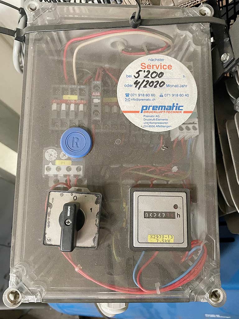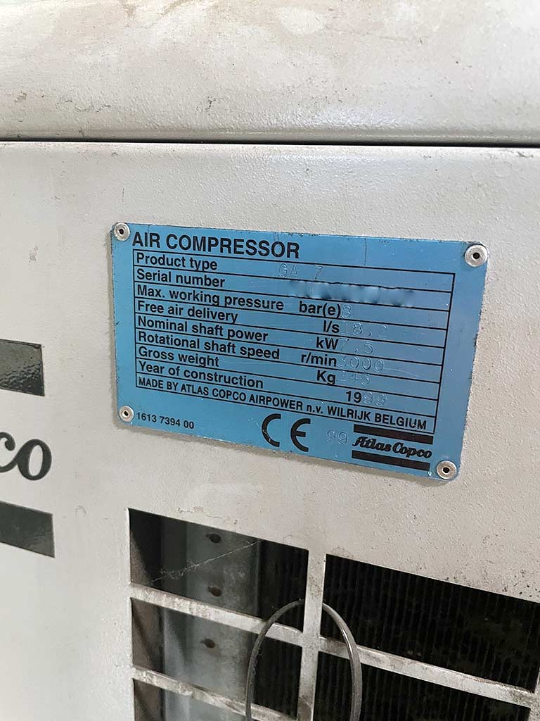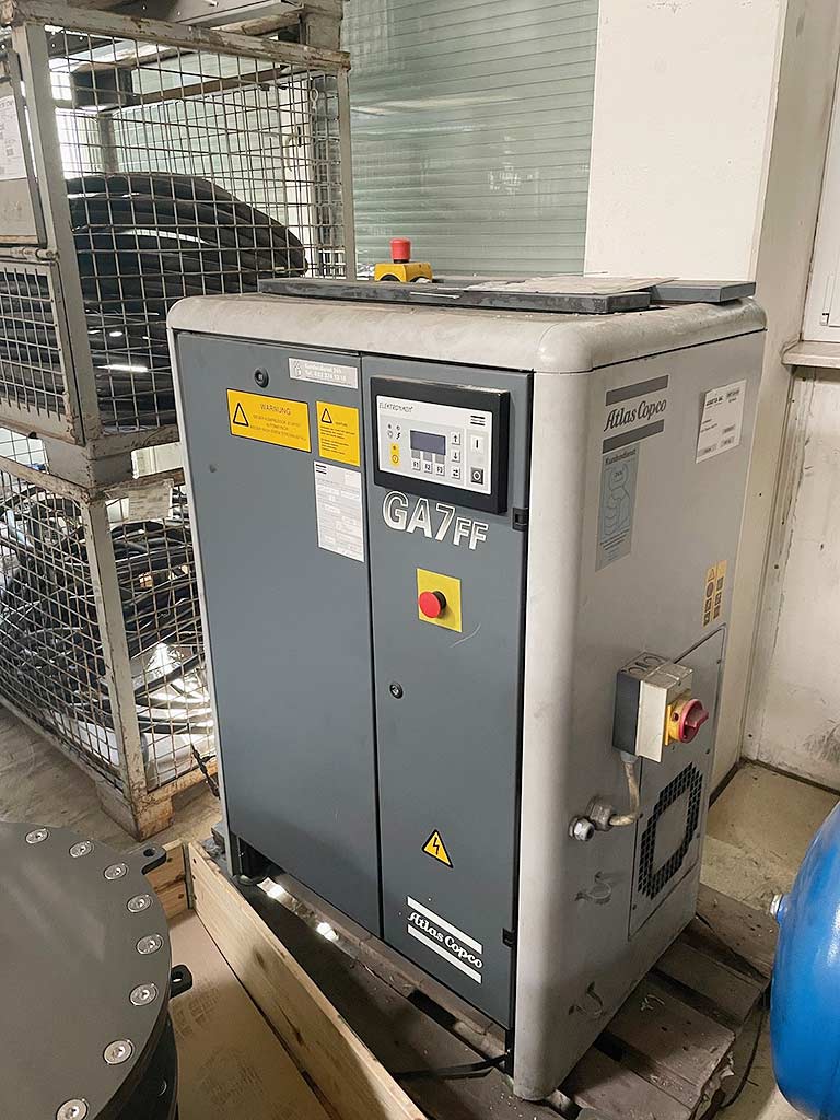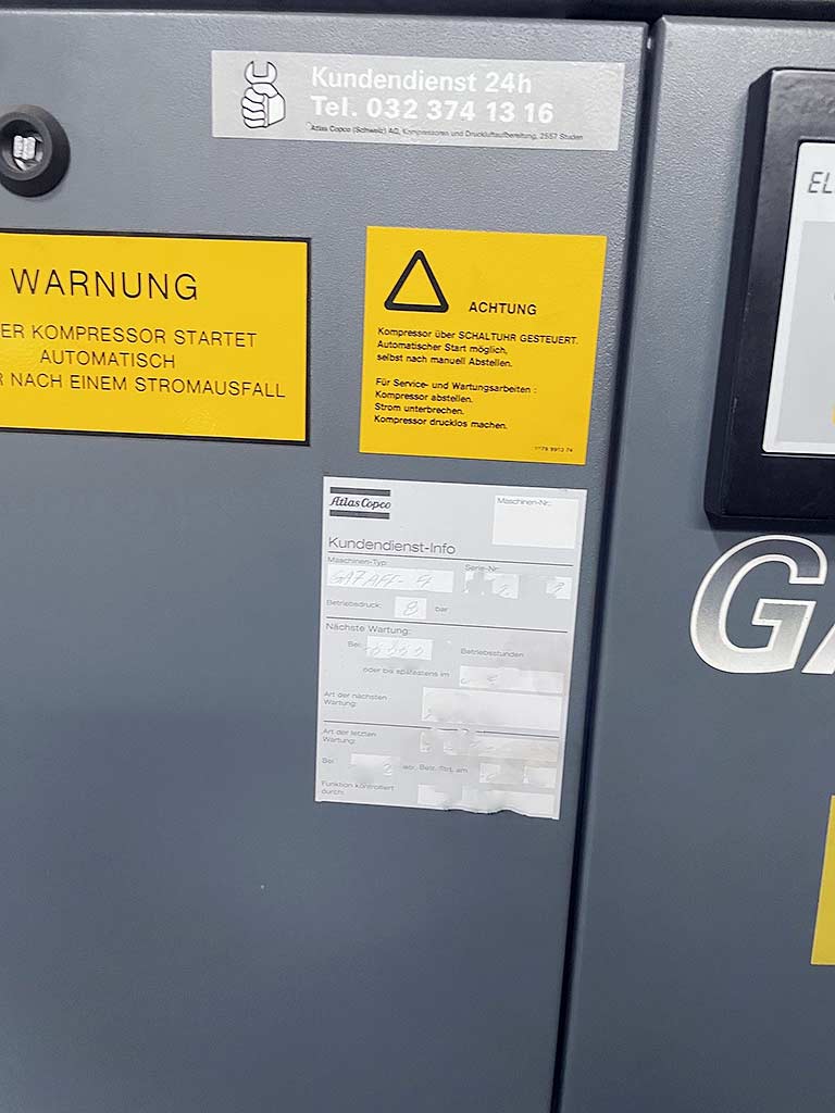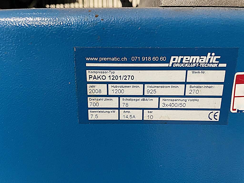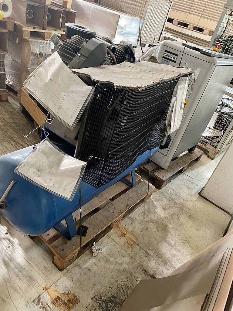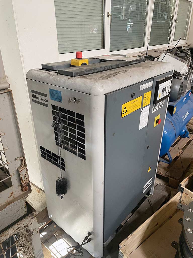 Description 1) Reciprocating compressor Prematic PAKO 1201/270, year of manufacture: 2008, displacement: 1200L/min, flow rate: 925L/min, tank volume: 270L, speed: 700rpm, power: 7.5kW, operating pressure: 10bar, operating hours: approx. 5257h. 2) Screw compressor Atlas Copco GA7FF, year of manufacture: 1999, operating pressure: 8bar, flow rate: 1092L/min, power: 7.5kW, speed: 3000rpm, weight: approx. 250kg, operating hours: 14057h. Documentation available. An on-site inspection is possible. |