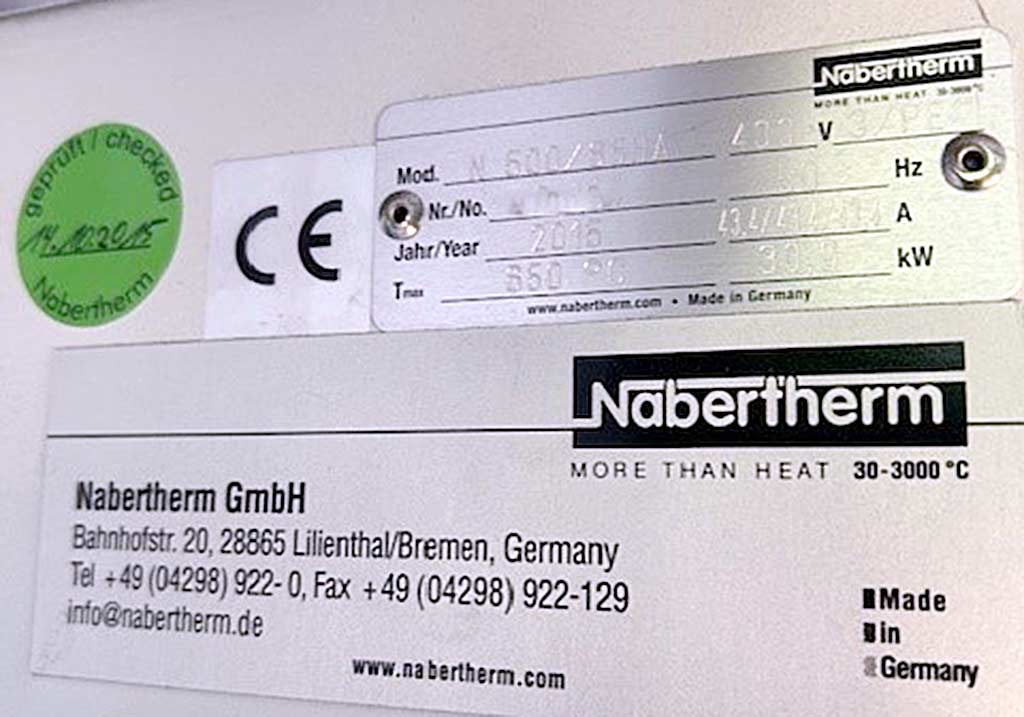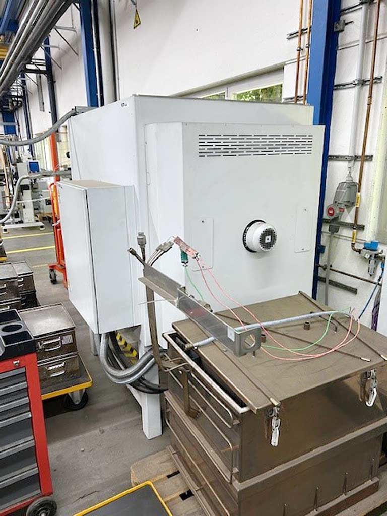 | Description A Nabertherm circulating air chamber furnace is available. Connected load: 30kW, max. temperature: 650°C, volume: 500l, heating-up time: approx. 60min, internal dimensions X/Y/Z: 750mm/1000mm/750mm. Machine dimensions: approx. 1300mm/1900mm/1850mm, weight: approx. 750kg. Documentation available. On-site inspection possible. |