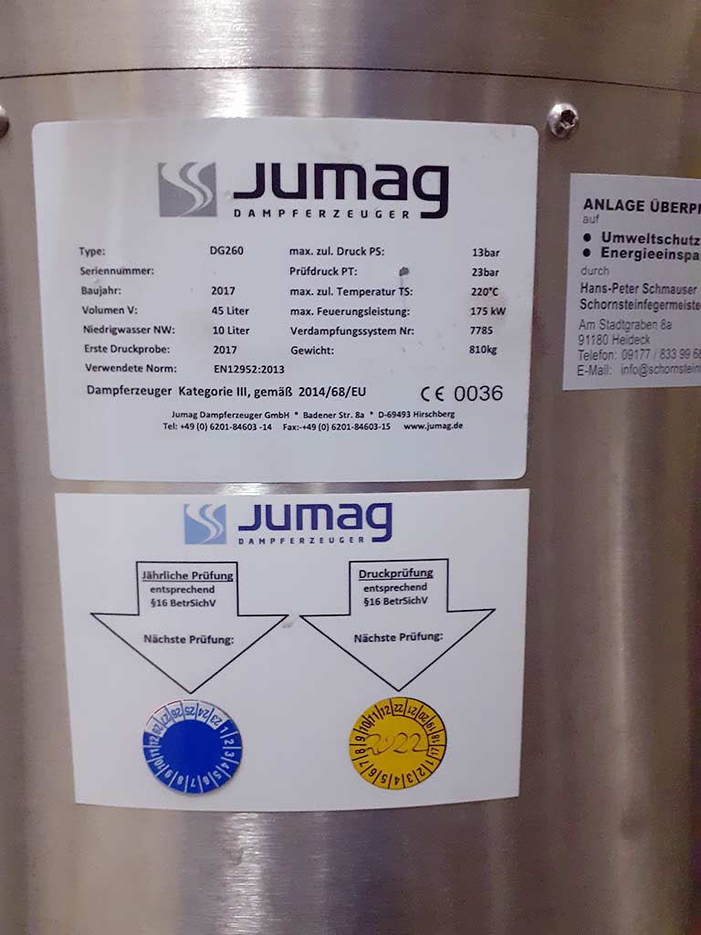 | Description A Jumag steam generator including burner is available. Volume: 45l, max. operating pressure: 13bar, max. test pressure: 23bar, max. temperature: 220°C, heating capacity: 175kW. Weight: approx. 810kg, boiler hours: 3013h, burner hours: 2652h. Documentation available. On-site inspection is possible. |
