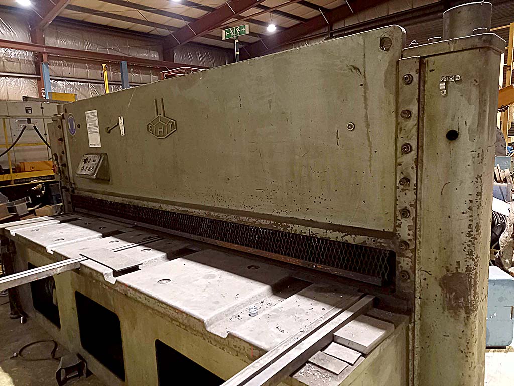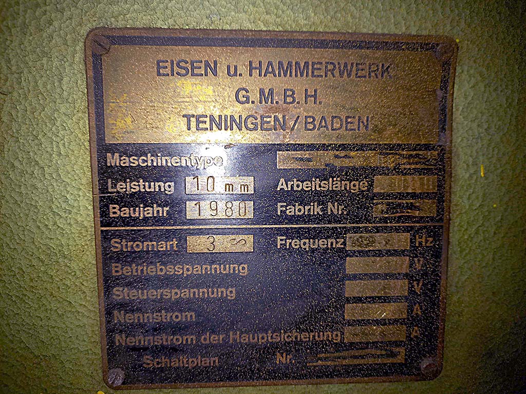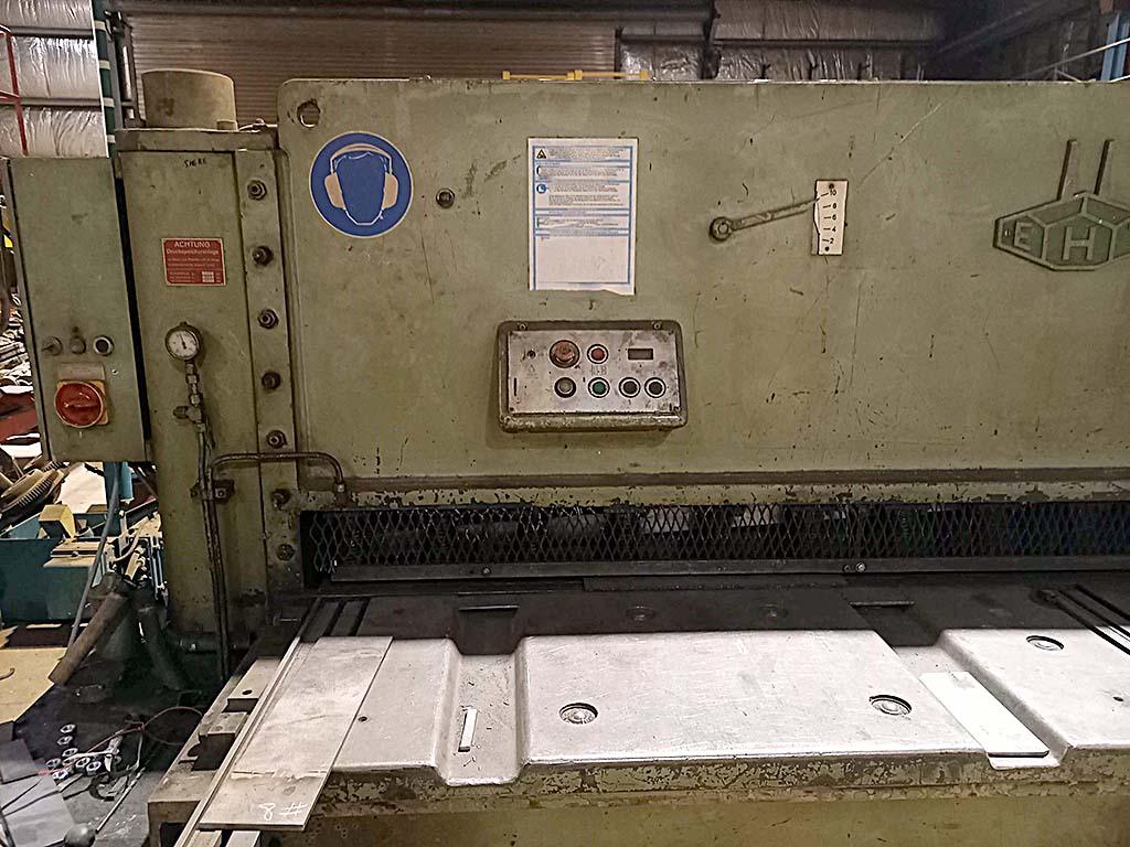 | Description Guillotine shear by Eisen u. Hammerwerk G.m.b.H., capacity: 10mm, working length: 3000mm, year of manufacture: 1980. An inspection can be arranged by appointment. | |