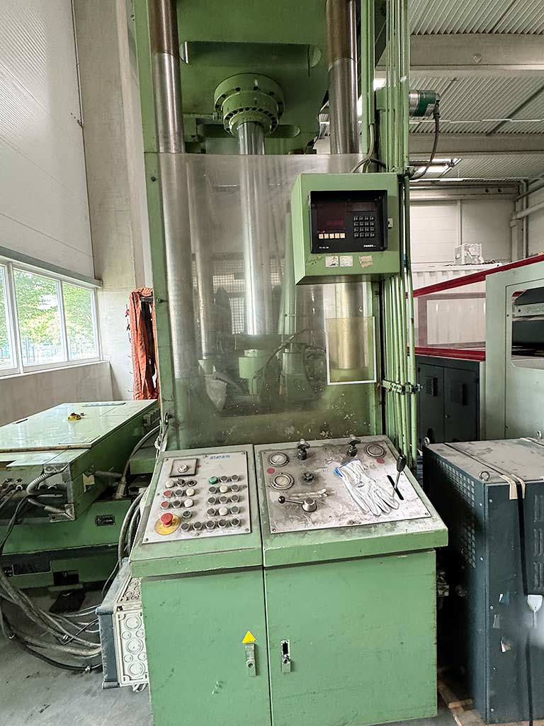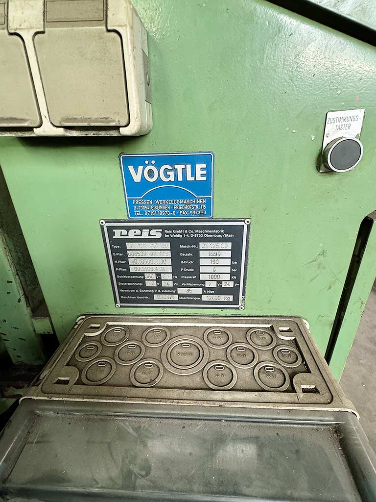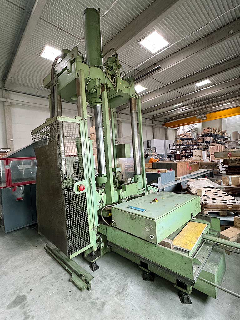 | Description A Reis spotting press for tool and mold making is available. Pressing force: 1000kN, clamping area: 1200mm/1500mm, installation height: 1575mm, max. mold weight: 10000kg, max. tilting plate load: 4000kg, ram stroke: 1450mm, return force: 400kN, hydraulic pressure: 190bar, pneumatic pressure: 5bar. Machine dimensions X/Y/Z: approx. 3200mm/4500mm/4100mm. Documentation available. On-site inspection possible.  |