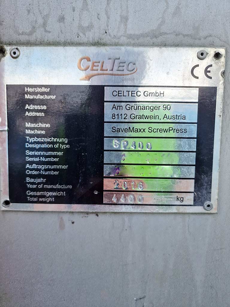 | Description A screw press for dewatering purposes is available. Screw diameter: 400mm, residual moisture range: 35%-45%, throughput range: 1t-4t/h, weight: approx. 4400kg. Documentation available. An on-site inspection is possible. |