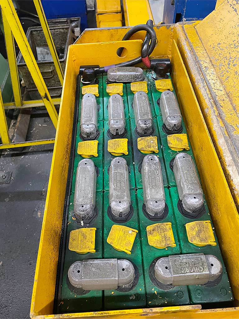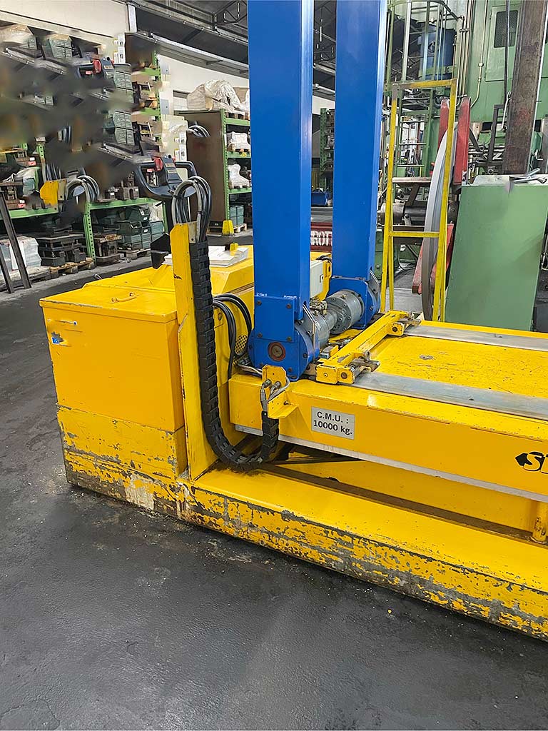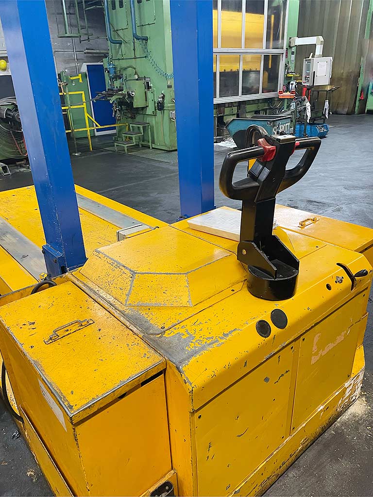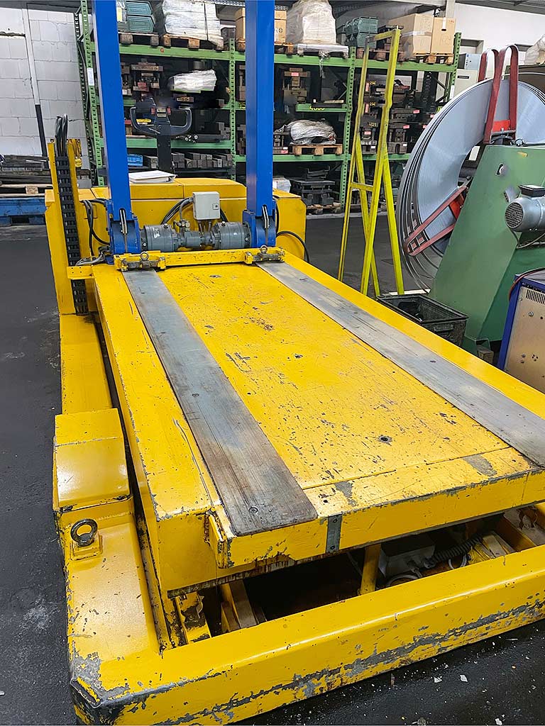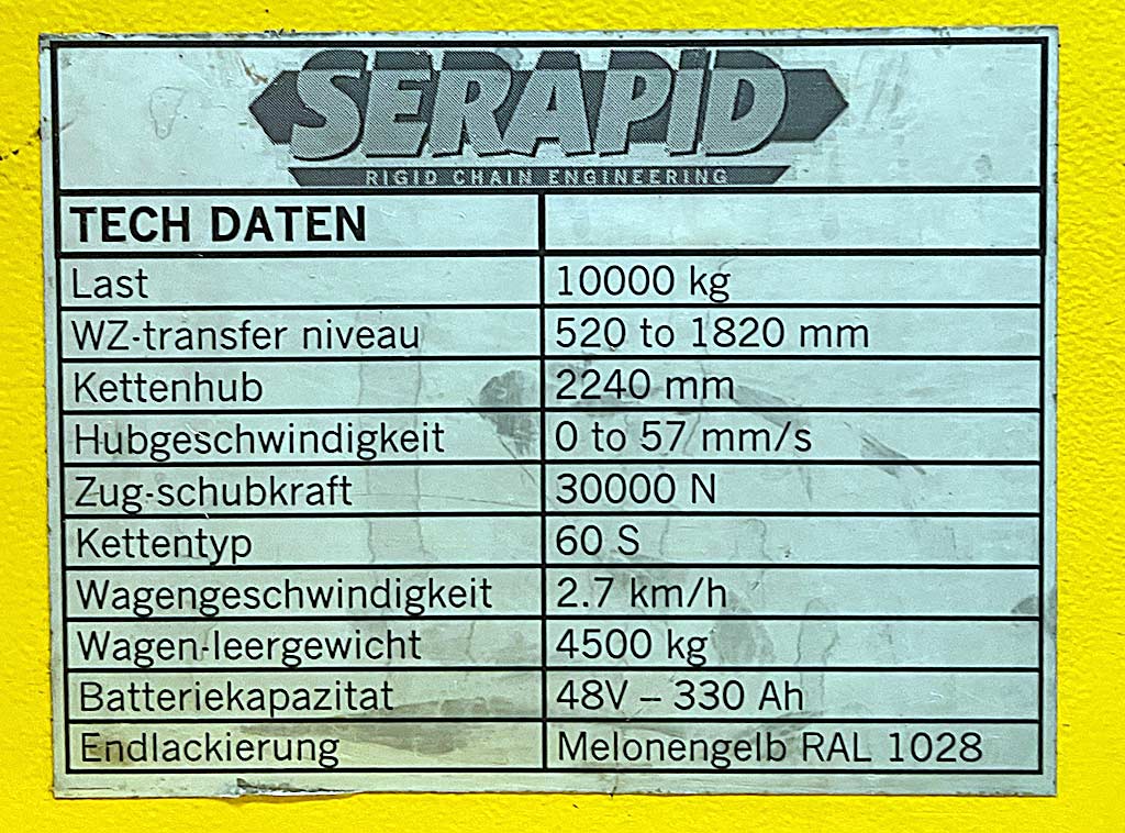 | Description An electrically operated lifting and transport trolley Serapid with rigid push chain is available. Loading position min./max.: 520mm/2820mm, max. trolley load: 10000kg, max. lifting speed under load: 50mm/s, chain stroke: 2240mm, chain travel speed: 57mm/s, pushing force: 30kN, chain type: 60S, trolley speed: 2.7km/h, ground clearance: 30mm. Machine dimensions X/Y/Z: approx. 3450mm/1700mm/2100mm, weight: approx. 4500kg. Documentation available. An on-site inspection is possible. |