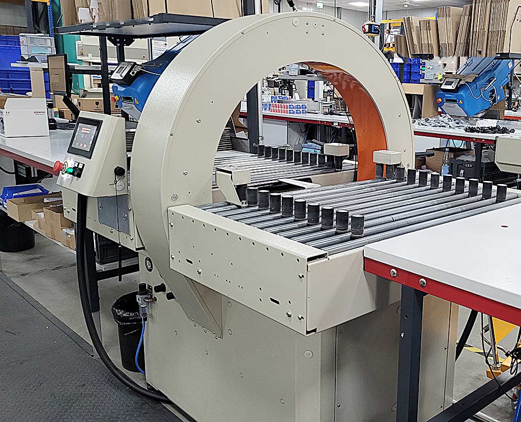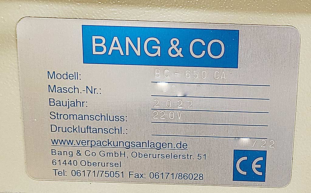 | Description A fully automatic horizontal tunnel stretch wrapper Bang & Co for securing products on corrugated cardboard blanks is available. Turntable speed: 100rpm, max. conveyor speed: 18m/min, carton width range: 70mm-650mm, min. product length: 200mm, max. spool diameter: 140mm, max. spool height: 125mm, film roll inner diameter: 38mm, film thickness range: 18µm-40µm. Machine dimensions X/Y/Z: approx. 1600mm/1250mm/1650mm, weight: approx. 500kg, operating hours: approx. 6851h. Dokumentation vorhanden. An on-site inspection is possible. |