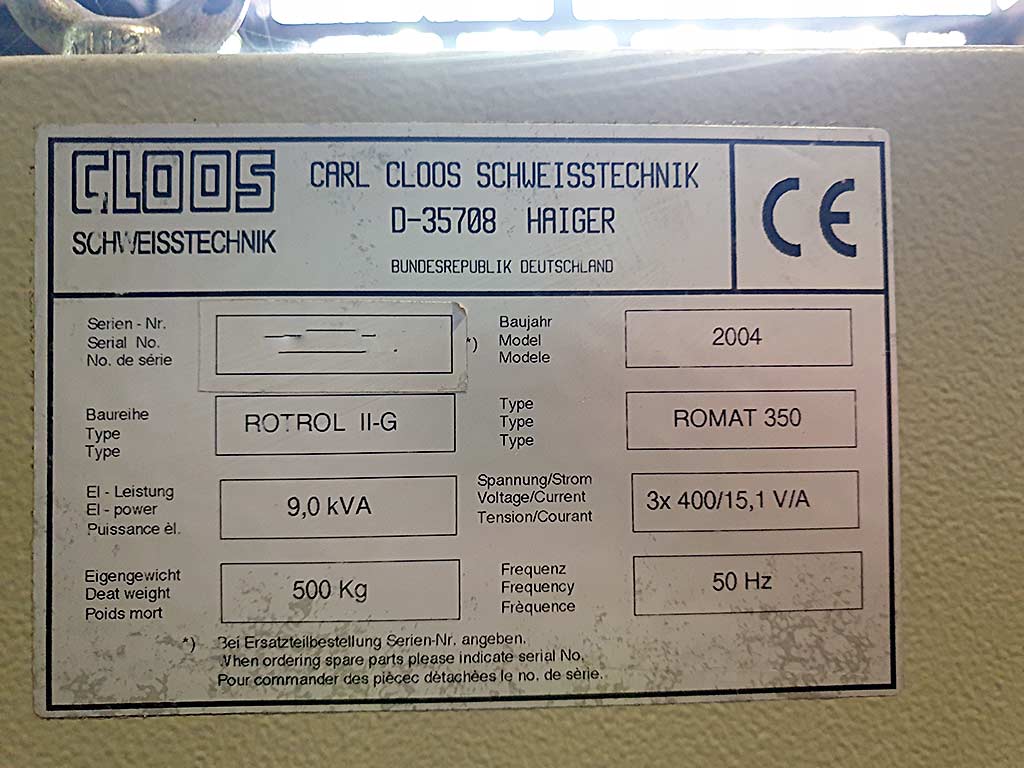 | Description A completely overhauled automatic welding station Cloos from the year 2025 including two rotary tables is available. Robot type: Romat 350, welding source: GL 300 IHPR, control system: Rotrol II, welding process: TIG. Rotary table load capacity: 2x250kg, rotary table type: WPEK-DP-KP-2.5kN, axes: 6+2+2. Documentation vorhanden. An on-site inspection is possible. |